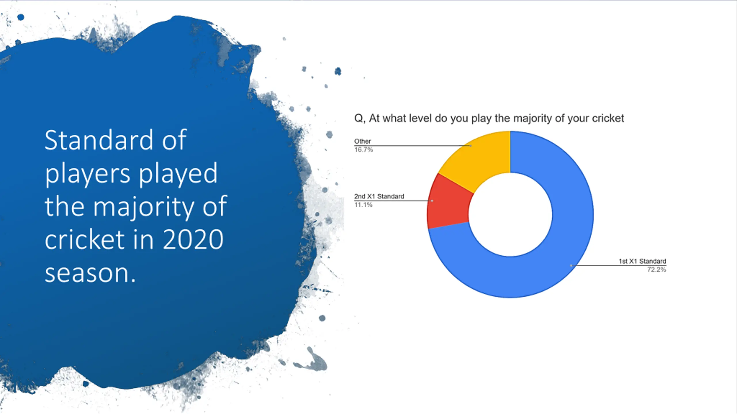 213 responses who affiliate themselves to SWPCL ranging from all 20 clubs 175 of the responses were form players 20 of those responders were captains 12 represent U18 players 22 represent volunteers (Chairperson, coach, CWO etc) 19 responses form Umpires/scorers 33 % said they played about the same 67 % played less than 2019 season 72 % 1 xl Standard 11% 2 xl Standard 16% Other Detail of the responders of the survey