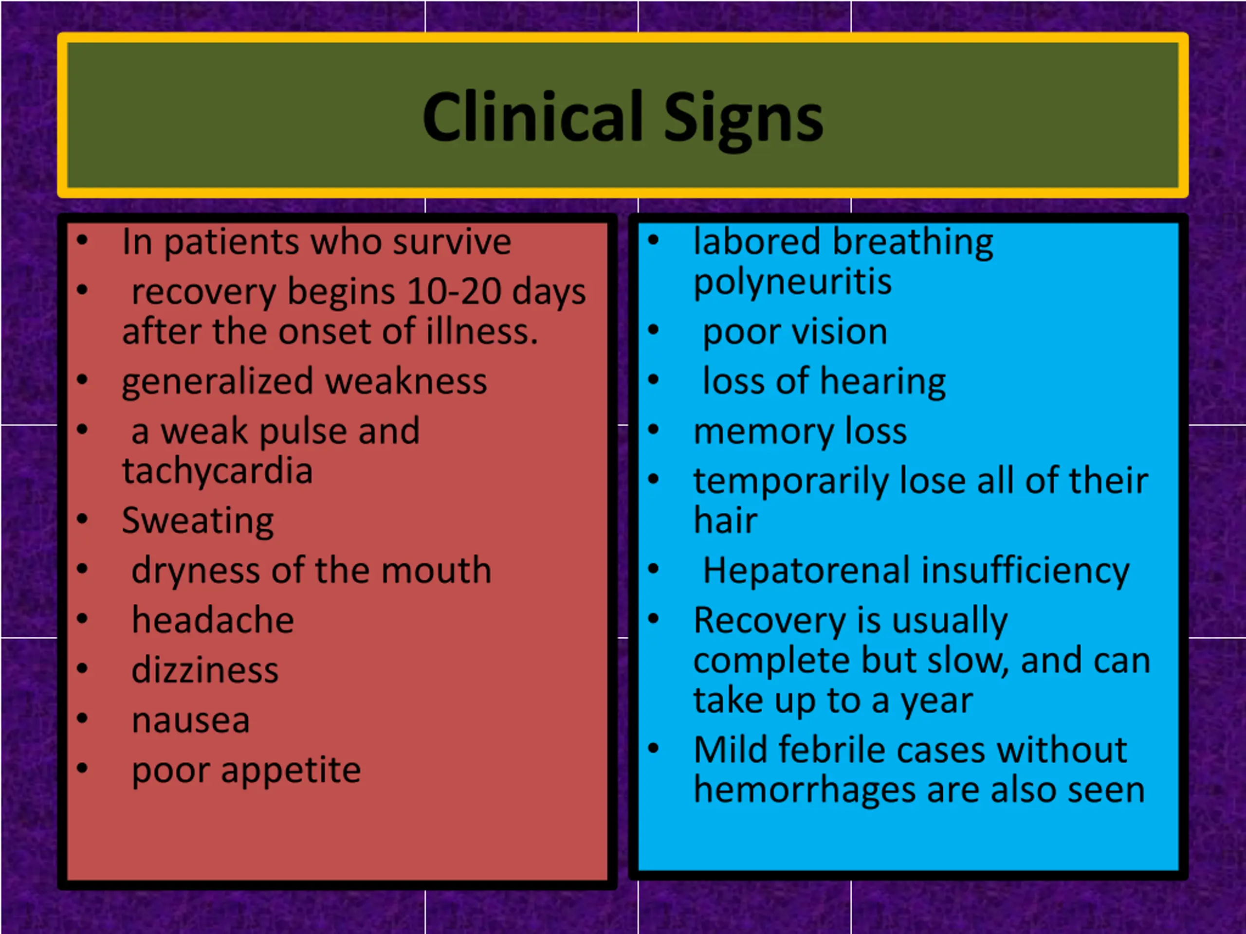 Clinical Signs In patients who survive recovery begins 10-20 days after the onset of illness. generalized weakness a weak pulse and tachycardia Sweating dryness of the mouth headache dizziness nausea poor appetite labored breathing polyneuritis poor vision loss of hearing memory loss temporarily lose all of their hair Hepatorenal insufficiency Recovery is usually complete but slow, and can take up to a year Mild febrile cases without hemorrhages are also seen