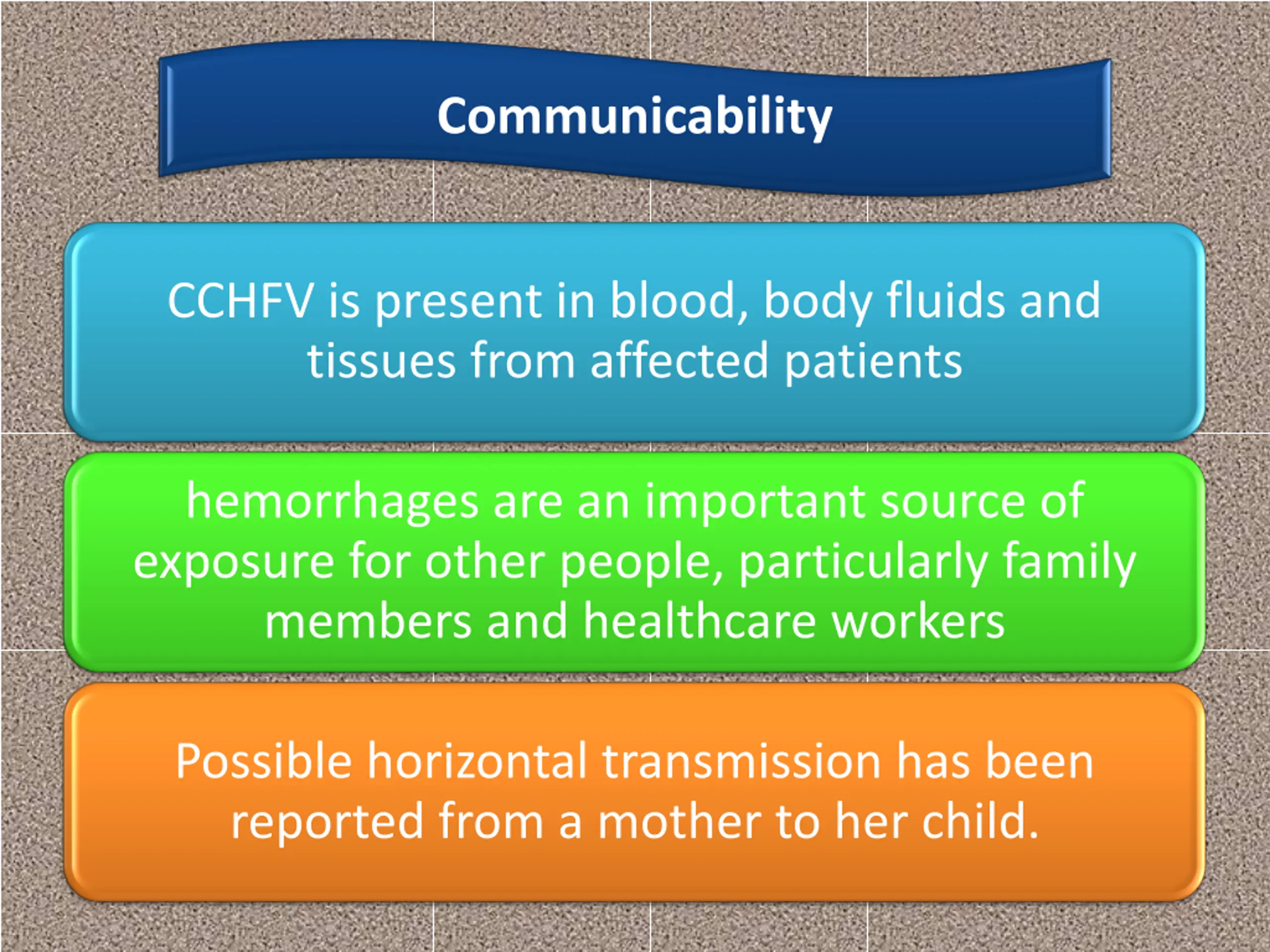 Communicability CCHFV is present in blood, body fluids and tissues from affected patients hemorrhages are an important source of exposure for other people, particularly family members and healthcare workers Possible horizontal transmission has been reported from a mother to her child.