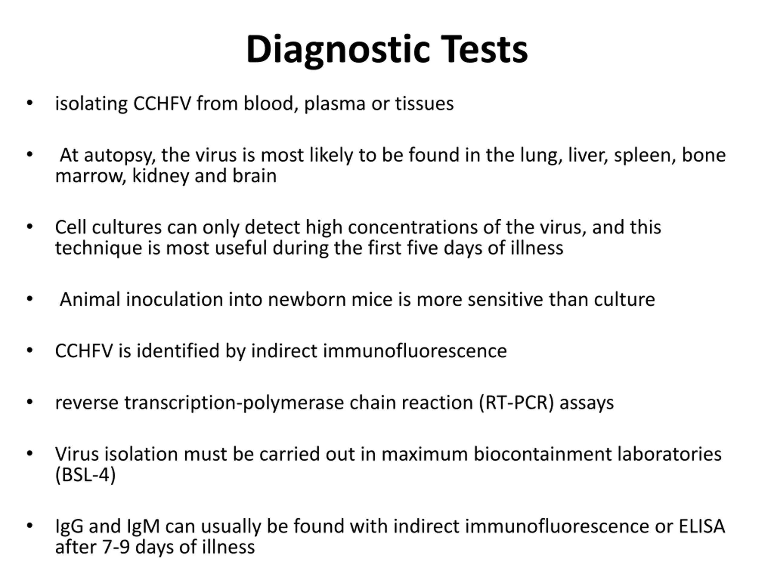 Diagnostic Tests isolating CCHFV from blood, plasma or tissues At autopsy, the virus is most likely to be found in the lung, liver, spleen, bone marrow, kidney and brain Cell cultures can only detect high concentrations of the virus, and this technique is most useful during the first five days of illness Animal inoculation into newborn mice is more sensitive than culture CCHFV is identified by indirect immunofluorescence reverse transcription-polymerase chain reaction (RT-PCR) assays Virus isolation must be carried out in maximum biocontainment laboratories (BSL-4) IgG and IgM can usually be found with indirect immunofluorescence or ELISA after 7-9 days of illness