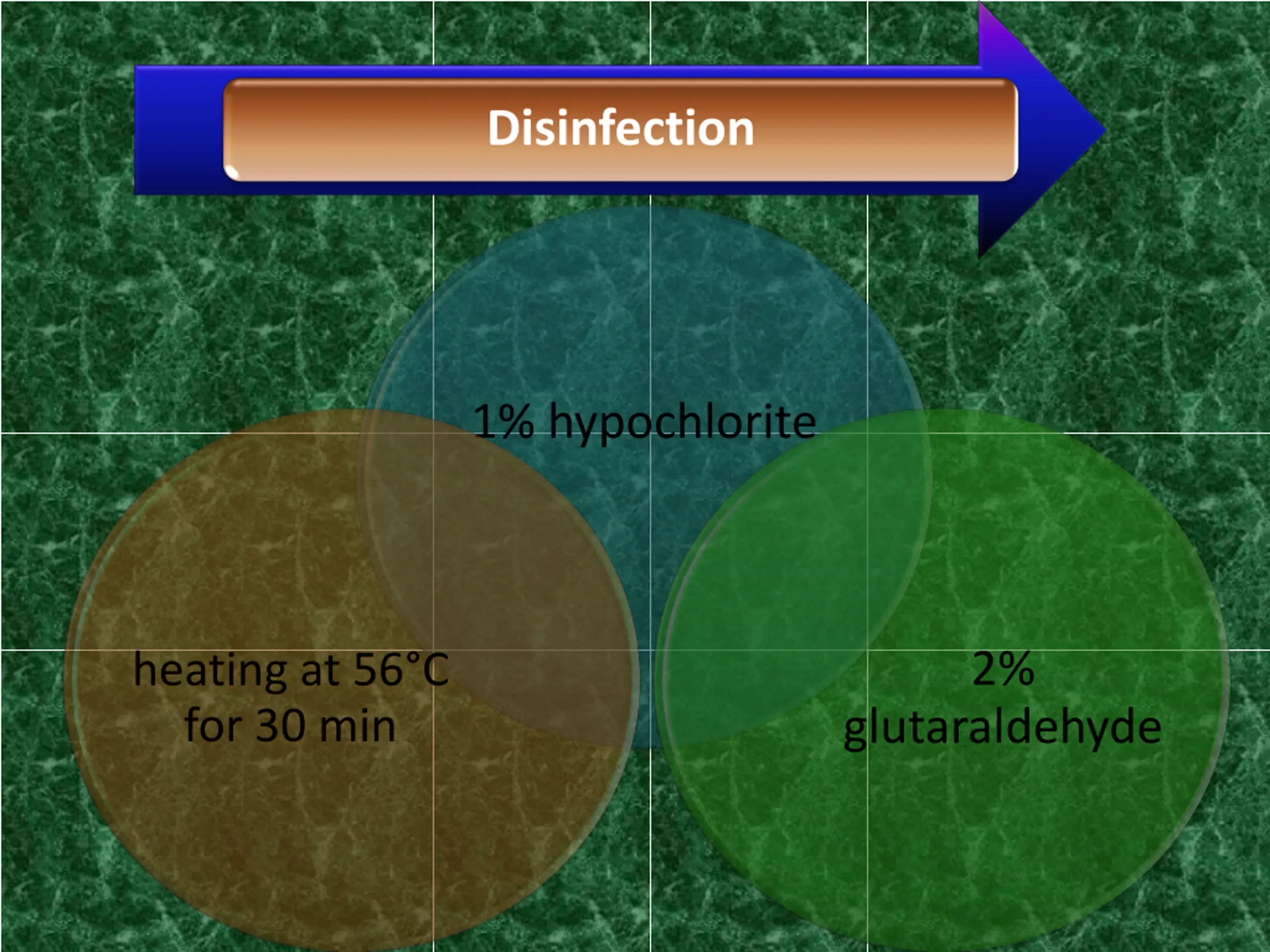 Disinfection 1% hypochlorite 2% heating at 56 C for 30 min glutaraldehyde