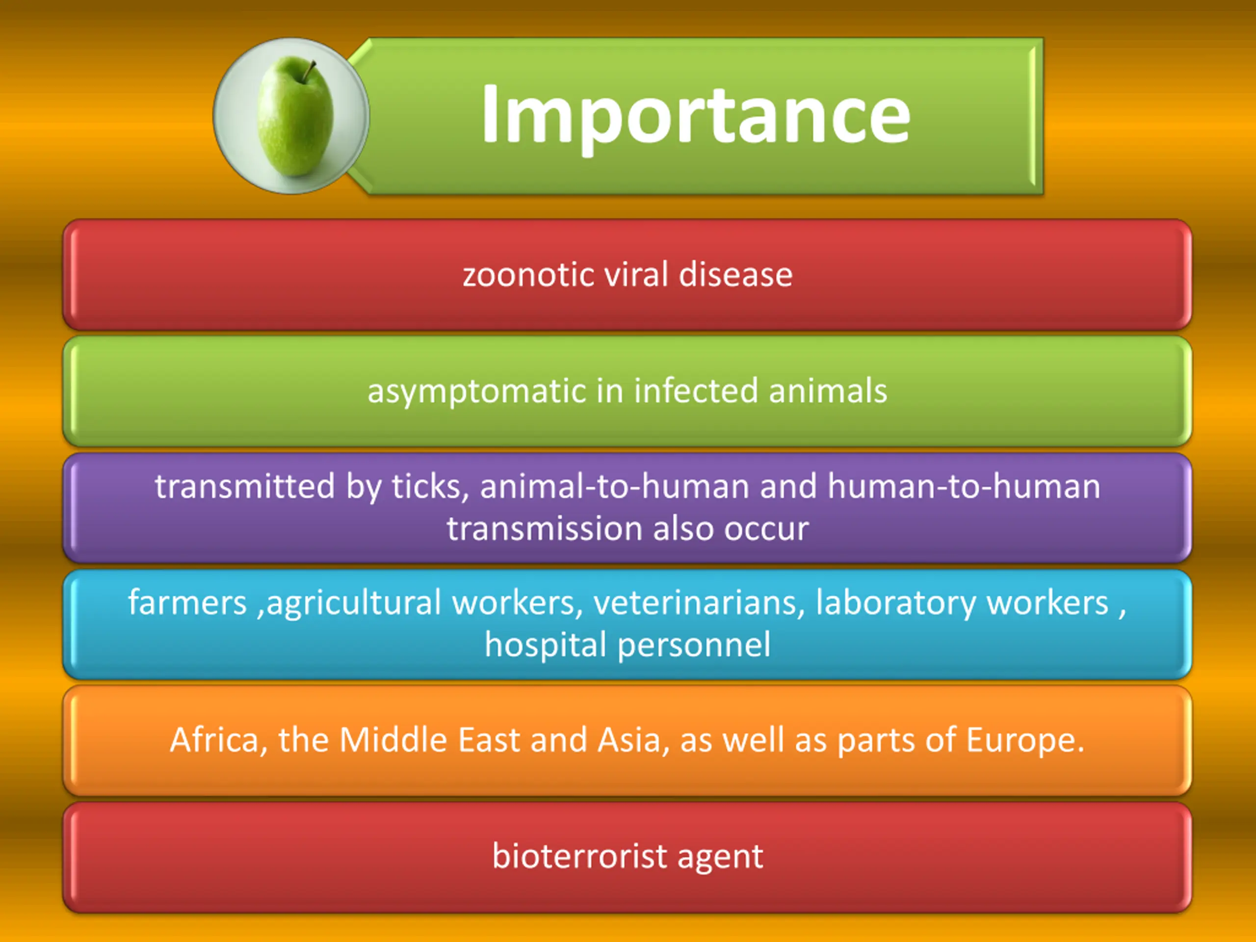 Importance zoonotic viral disease asymptomatic in infected animals transmitted by ticks, animal-to-human and human-to-human transmission also occur farmers ,agricultural workers, veterinarians, laboratory workers , hospital personnel Africa, the Middle East and Asia, as well as parts of Europe. bioterrorist agent