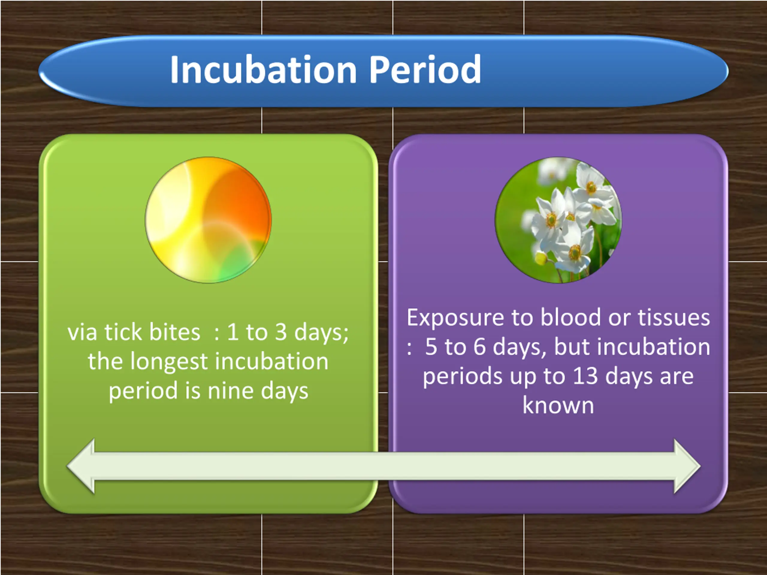 Incubation Period Exposure to blood or tissues : 5 to 6 days, but incubation periods up to 13 days are known via tick bites : 1 to 3 days; the longest incubation period is nine days