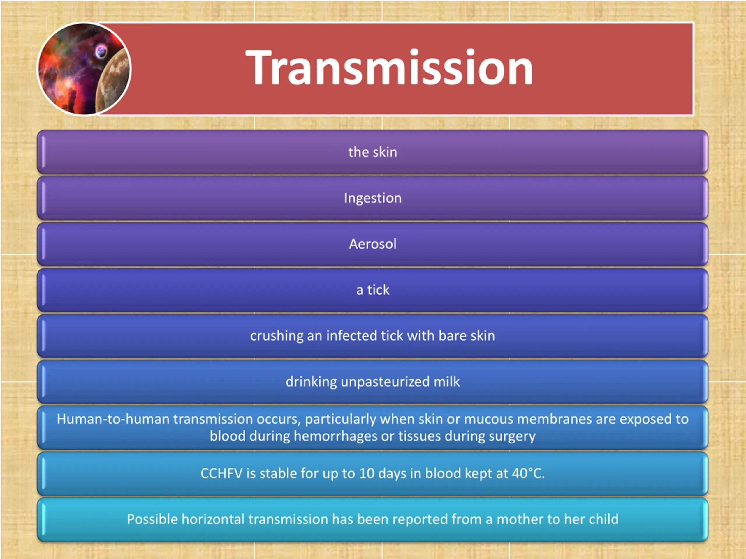 Transmission the skin Ingestion Aerosol a tick crushing an infected tick with bare skin drinking unpasteurized milk Human-to-human transmission occurs, particularly when skin or mucous membranes are exposed to blood during hemorrhages or tissues during surgery CCHFV is stable for up to 10 days in blood kept at 40 C. Possible horizontal transmission has been reported from a mother to her child