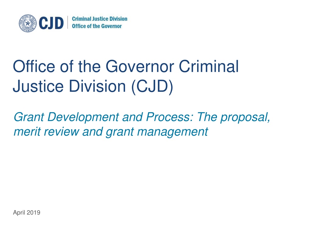 Office of the Governor Criminal Justice Division (CJD) Grant Development and Process: The proposal, merit review and grant management April 2019
