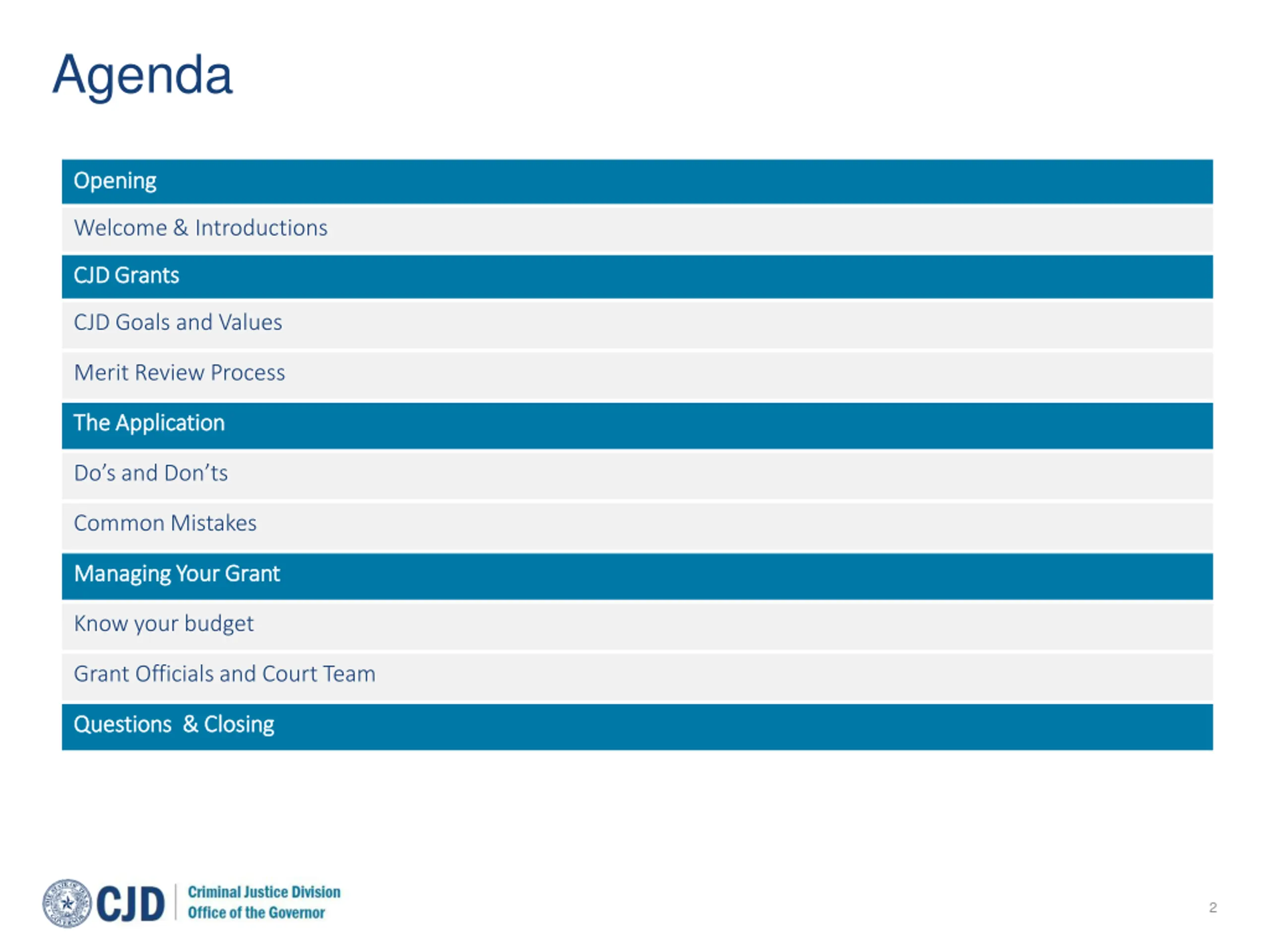 Agenda Opening Opening Welcome & Introductions CJD Grants CJD Grants CJD Goals and Values Merit Review Process The Application The Application Do s and Don ts Common Mistakes Managing Your Grant Managing Your Grant Know your budget Grant Officials and Court Team Questions Questions & Closing & Closing 2