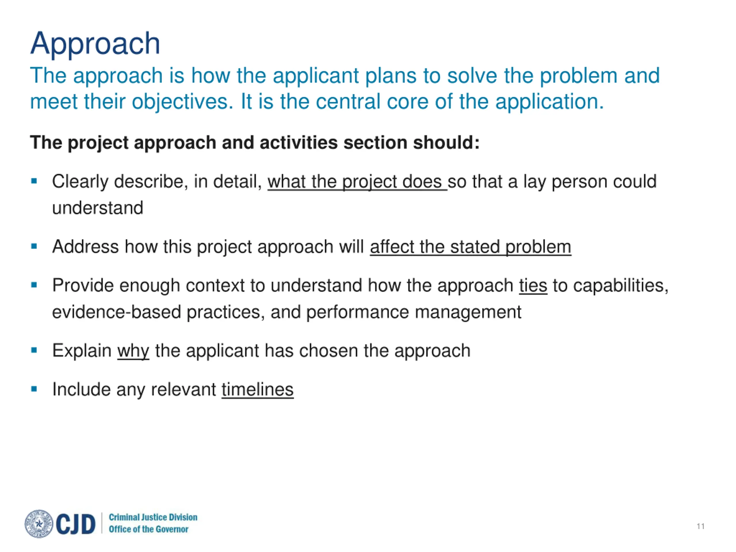 Approach The approach is how the applicant plans to solve the problem and meet their objectives. It is the central core of the application. The project approach and activities section should: Clearly describe, in detail, what the project does so that a lay person could understand Address how this project approach will affect the stated problem Provide enough context to understand how the approach ties to capabilities, evidence-based practices, and performance management Explain why the applicant has chosen the approach Include any relevant timelines 11