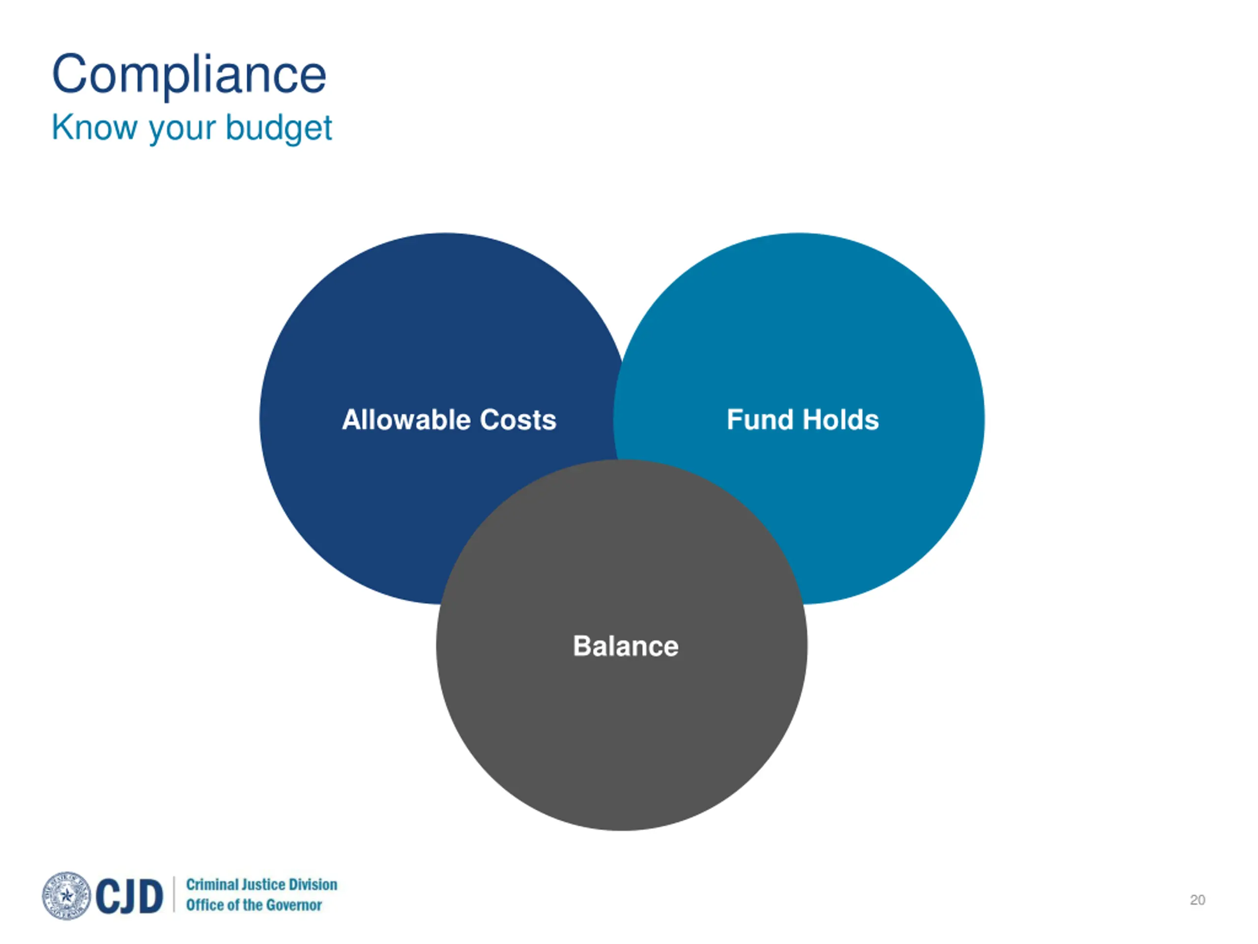 Compliance Know your budget Allowable Costs Fund Holds Balance 20