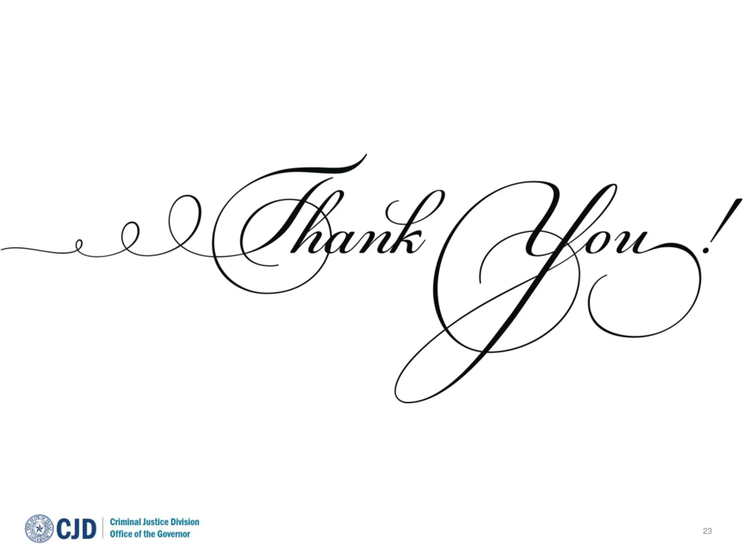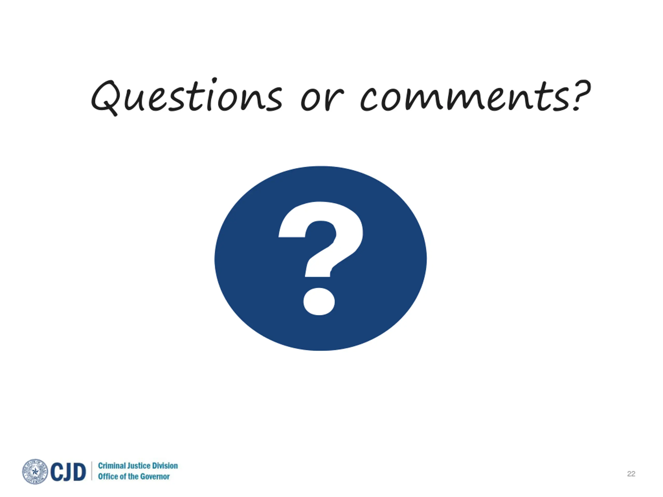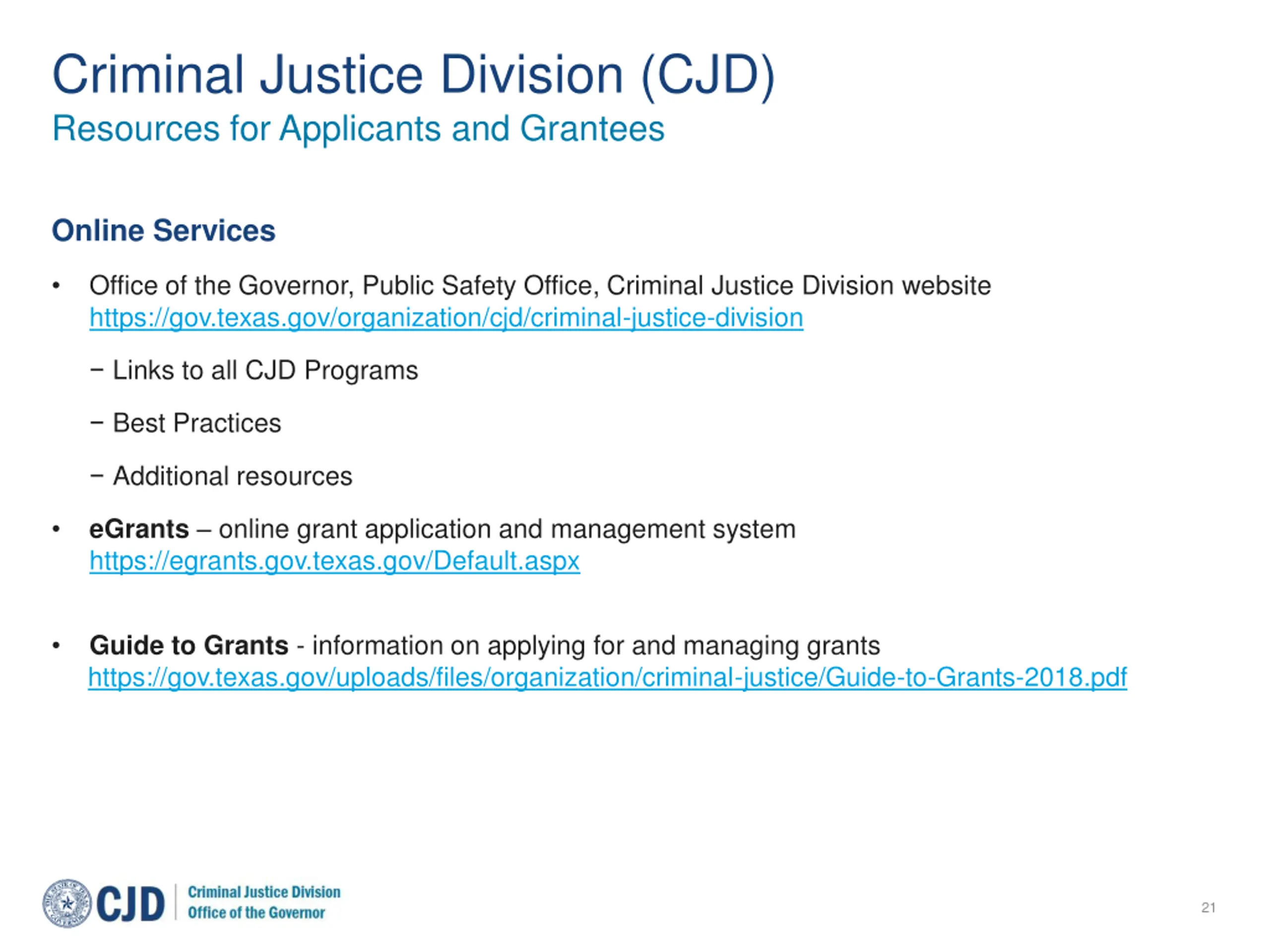 Criminal Justice Division (CJD) Resources for Applicants and Grantees Online Services Office of the Governor, Public Safety Office, Criminal Justice Division website https://gov.texas.gov/organization/cjd/criminal-justice-division Links to all CJD Programs Best Practices Additional resources eGrants online grant application and management system https://egrants.gov.texas.gov/Default.aspx Guide to Grants - information on applying for and managing grants https://gov.texas.gov/uploads/files/organization/criminal-justice/Guide-to-Grants-2018.pdf 21