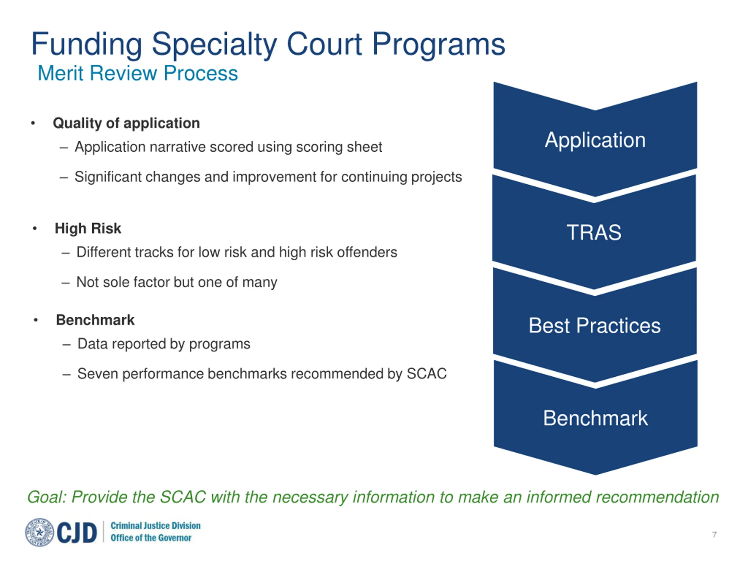Merit Review Overview Procedure for merit review session 1. Review Panels. SCAC members are divided into panels and assigned a role (primary, secondary, tertiary) for each application. 2. Application Packages. Panel participants review assigned applications, with individualized scoring sheets, and benchmark reports. 3. Discussion and Scoring. SCAC members review list of applications and discuss strengths/weaknesses and preliminary scores to determine final score. Members with a COI are asked to step out for the discussion. 4. Tabulation of Scores and Funding Recommendation. Final scores are tabulated by staff and ranked for level of funding based on scores. The SCAC recommends rankings to the Executive Director. 5. Final Approval by Executive Director. The executive director will consider merit review rankings along with other factors and make all final funding decisions. Per Rule 3.9 (a) of the Texas Administrative Code, all funding decisions made by the executive director are final and are not subject to appeal. 6. Office of the Governor Approval. All awards must go through financial, legal, and OOG Executive approval before release. 6