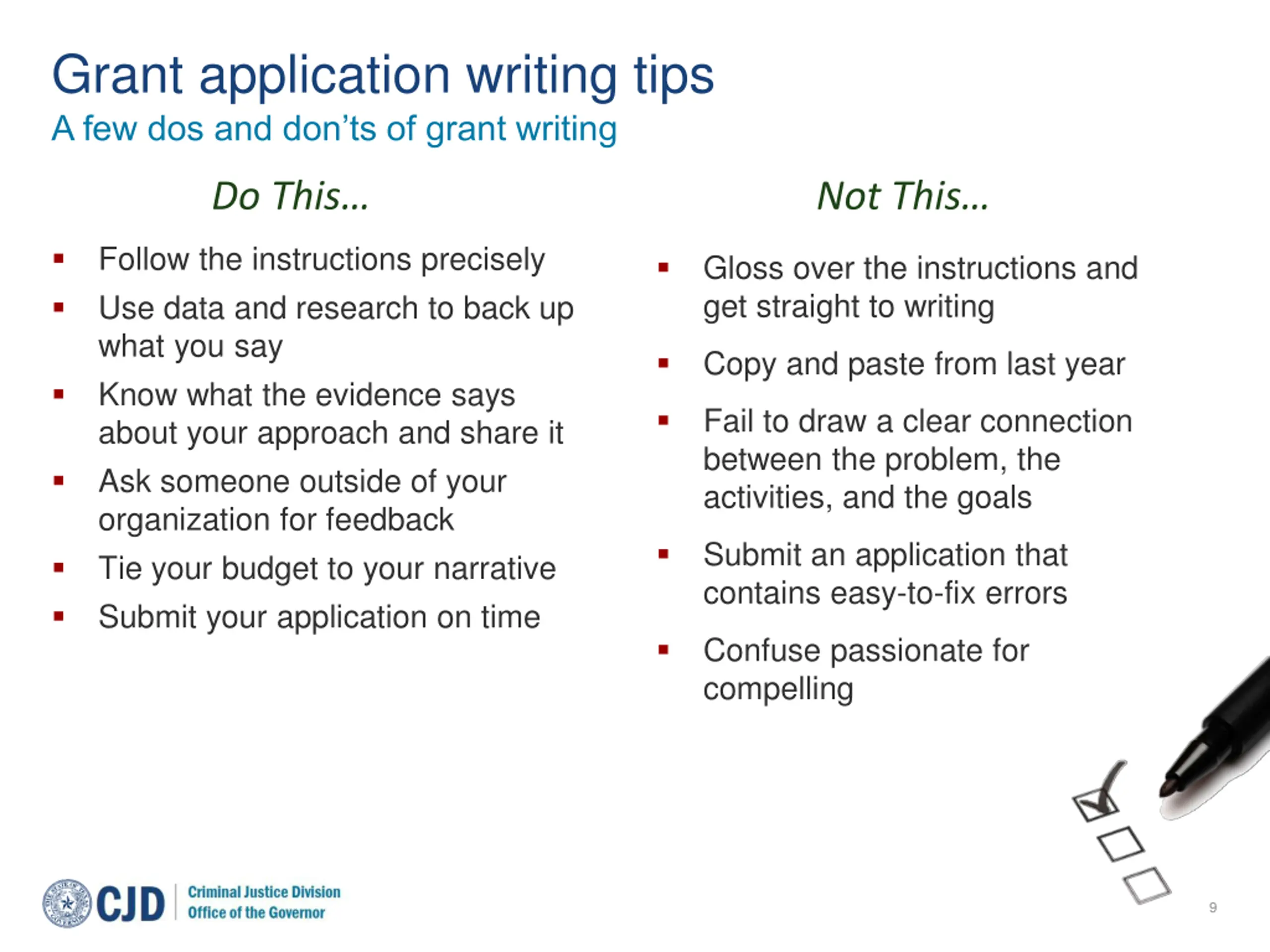 Grant application writing tips A few dos and don ts of grant writing Do This Not This Follow the instructions precisely Use data and research to back up what you say Know what the evidence says about your approach and share it Ask someone outside of your organization for feedback Tie your budget to your narrative Submit your application on time Gloss over the instructions and get straight to writing Copy and paste from last year Fail to draw a clear connection between the problem, the activities, and the goals Submit an application that contains easy-to-fix errors Confuse passionate for compelling 9