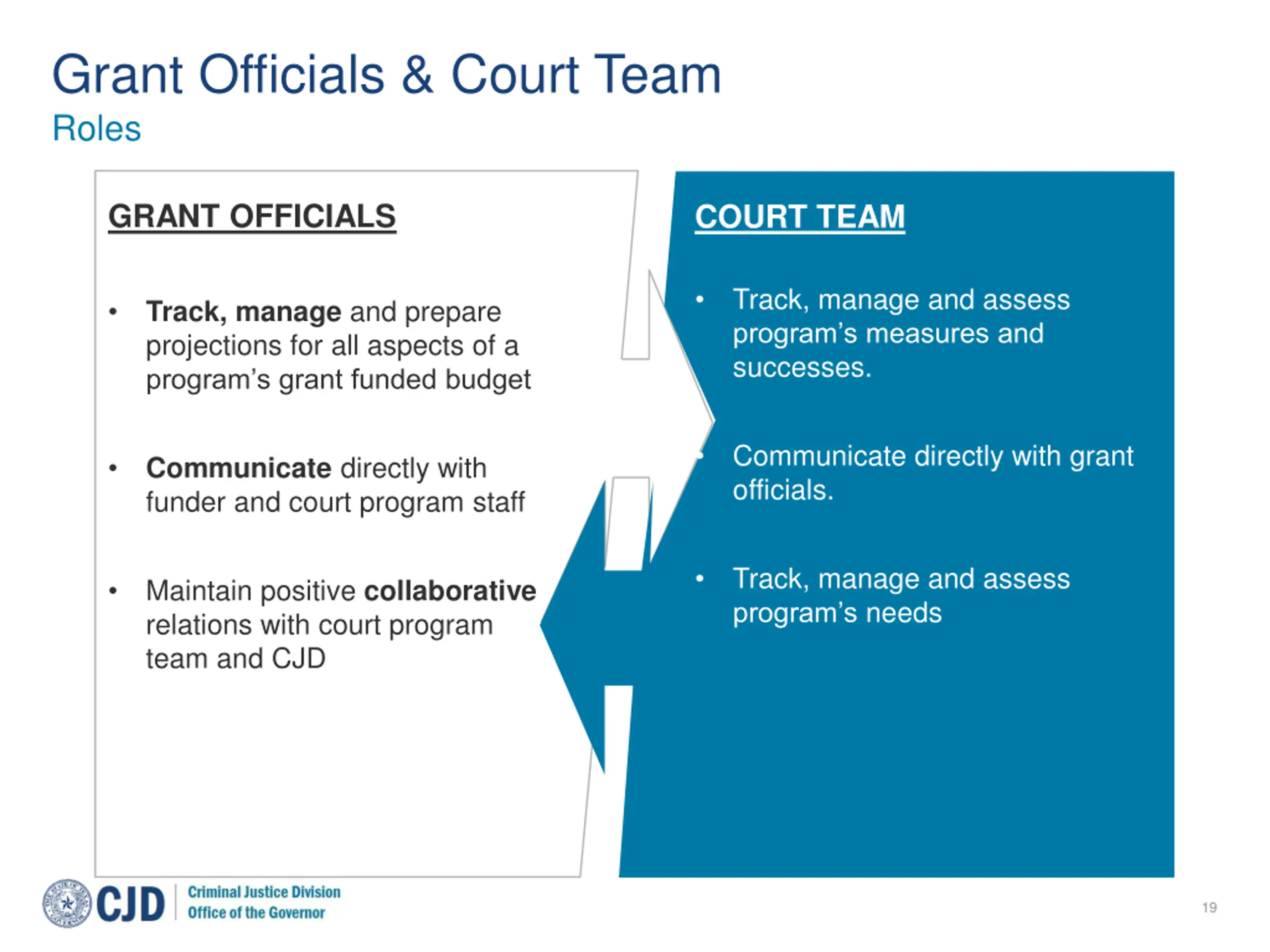 Grant Officials & Court Team Roles GRANT OFFICIALS COURT TEAM Track, manage and assess program s measures and successes. Track, manage and prepare projections for all aspects of a program s grant funded budget Communicate directly with grant officials. Communicate directly with funder and court program staff Track, manage and assess program s needs Maintain positive collaborative relations with court program team and CJD 19