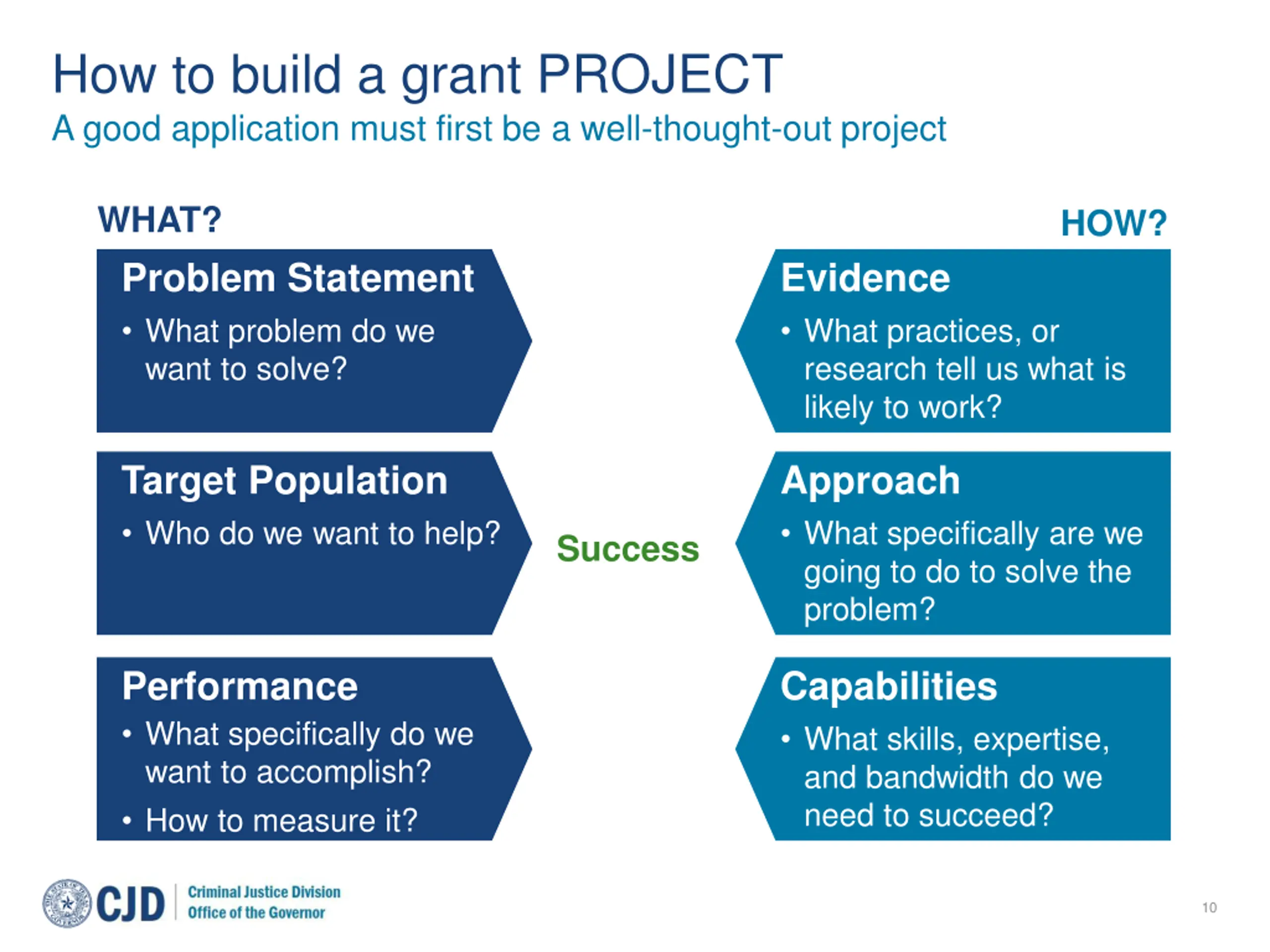 How to build a grant PROJECT A good application must first be a well-thought-out project WHAT? HOW? Problem Statement What problem do we want to solve? Evidence What practices, or research tell us what is likely to work? Target Population Who do we want to help? Approach What specifically are we going to do to solve the problem? Success Performance What specifically do we want to accomplish? How to measure it? Capabilities What skills, expertise, and bandwidth do we need to succeed? 10