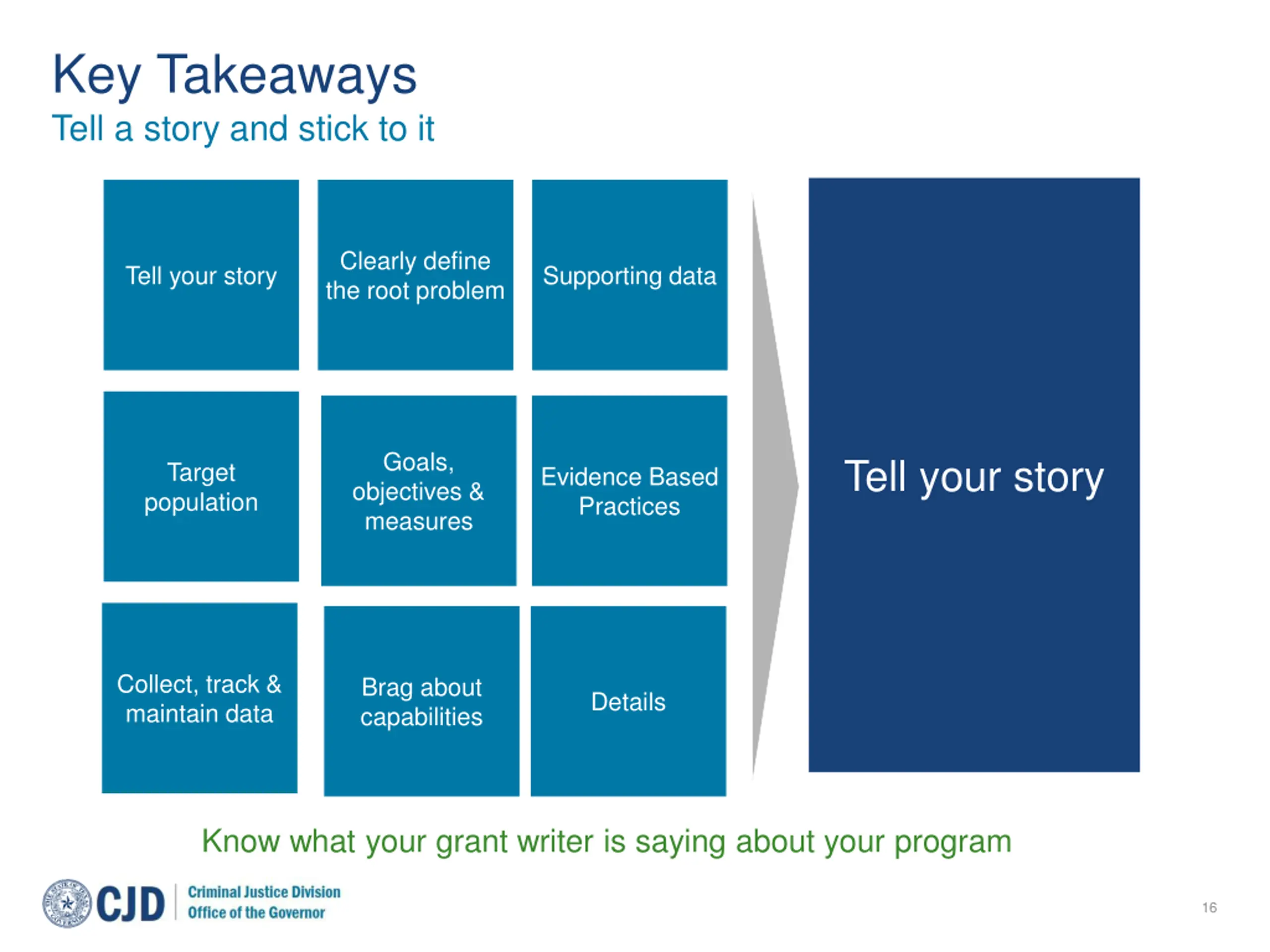 Key Takeaways Tell a story and stick to it Clearly define the root problem Tell your story Supporting data Goals, objectives & measures Tell your story Target population Evidence Based Practices Collect, track & maintain data Brag about capabilities Details Know what your grant writer is saying about your program 16