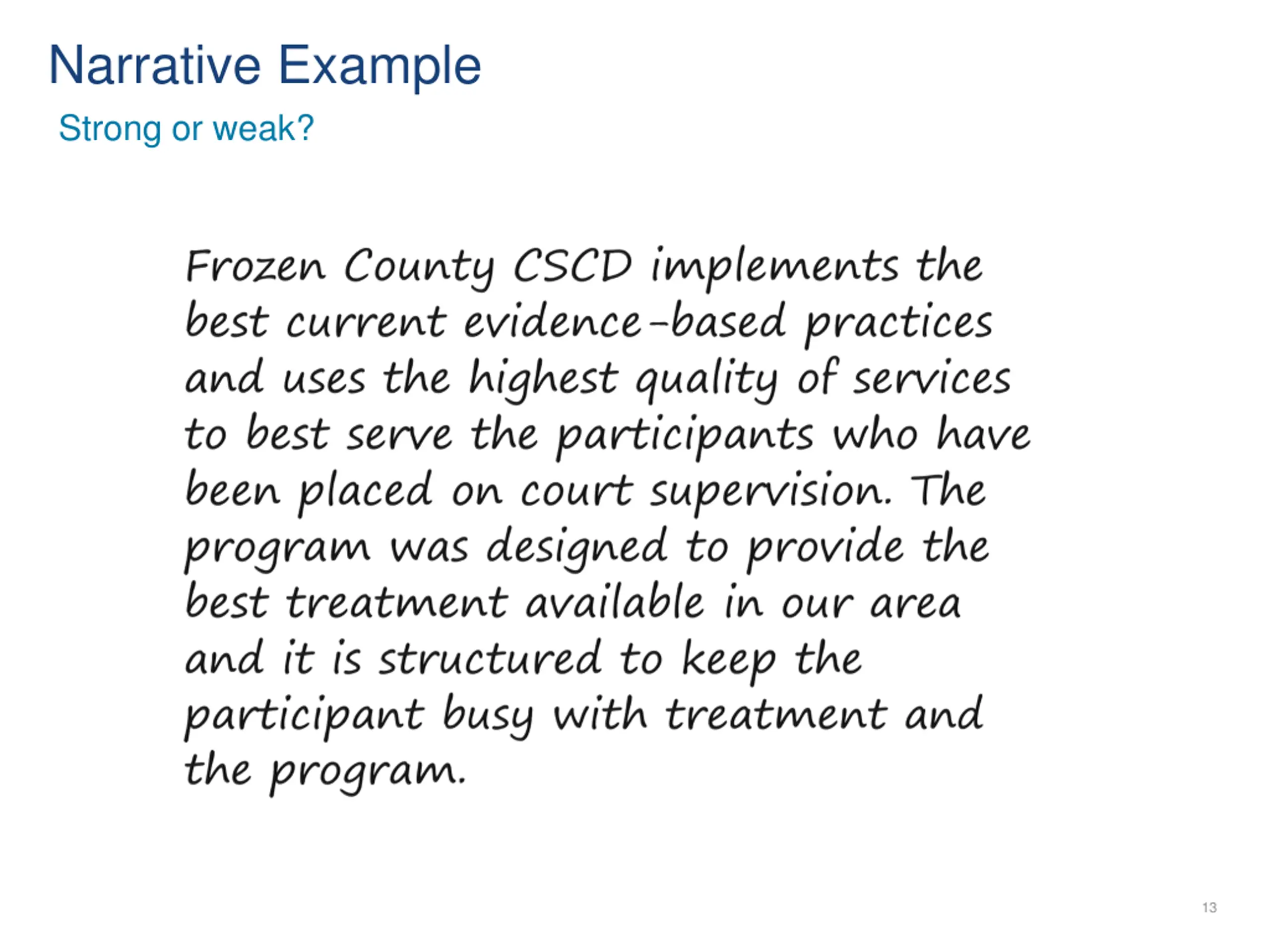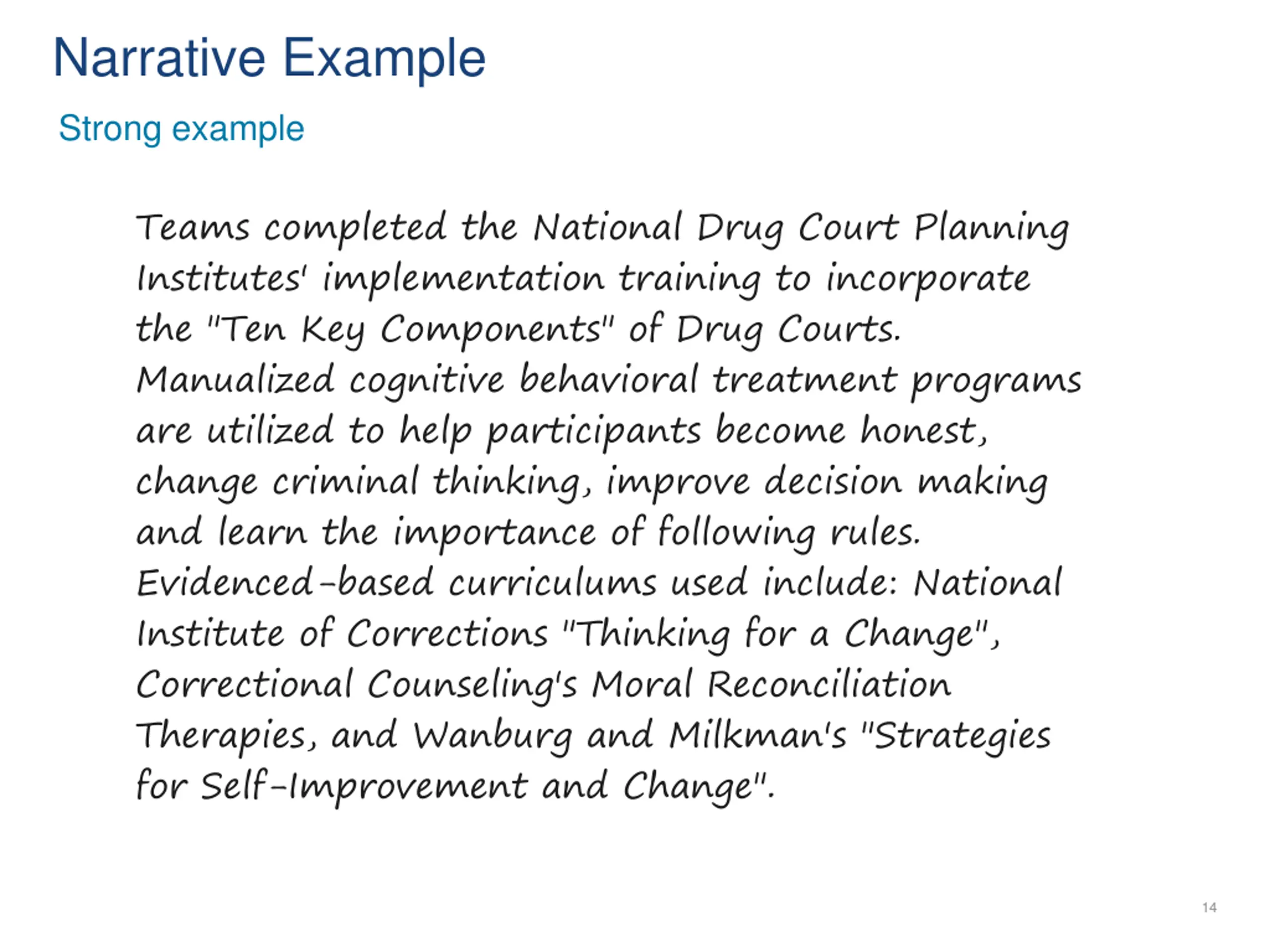 Narrative Example Strong example Teams completed the National Drug Court Planning Institutes' implementation training to incorporate the "Ten Key Components" of Drug Courts. Manualized cognitive behavioral treatment programs are utilized to help participants become honest, change criminal thinking, improve decision making and learn the importance of following rules. Evidenced-based curriculums used include: National Institute of Corrections "Thinking for a Change", Correctional Counseling's Moral Reconciliation Therapies, and Wanburg and Milkman's "Strategies for Self-Improvement and Change". 14