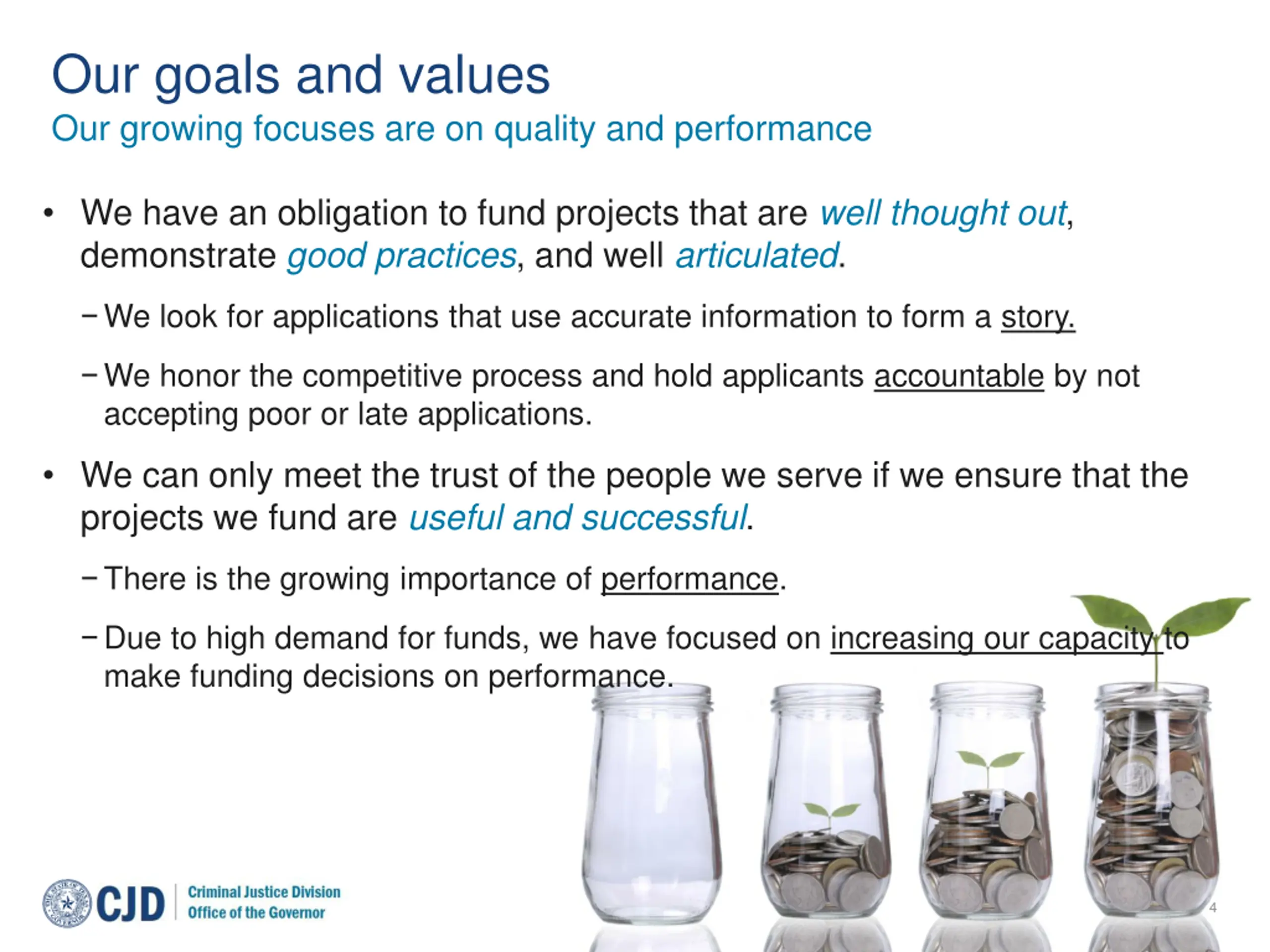 Our goals and values Our growing focuses are on quality and performance We have an obligation to fund projects that are well thought out, demonstrate good practices, and well articulated. We look for applications that use accurate information to form a story. We honor the competitive process and hold applicants accountable by not accepting poor or late applications. We can only meet the trust of the people we serve if we ensure that the projects we fund are useful and successful. There is the growing importance of performance. Due to high demand for funds, we have focused on increasing our capacity to make funding decisions on performance. 4
