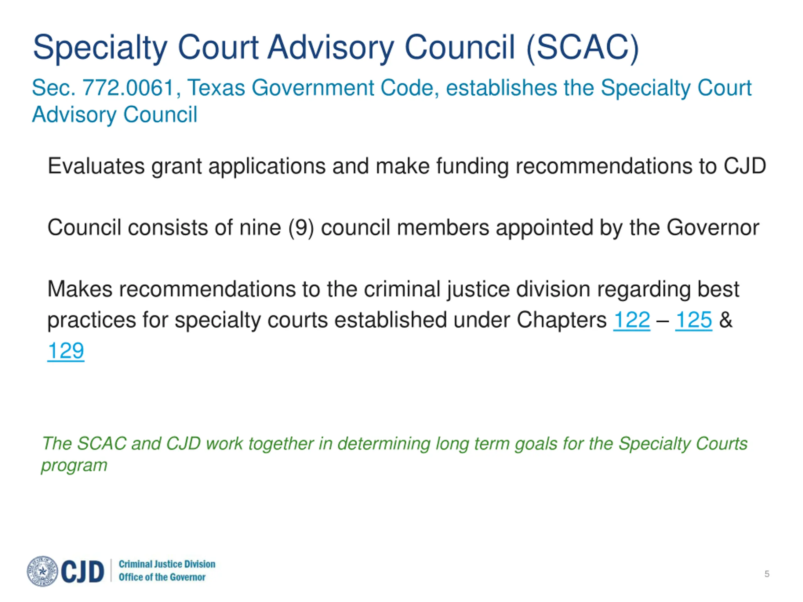 Specialty Court Advisory Council (SCAC) Sec. 772.0061, Texas Government Code, establishes the Specialty Court Advisory Council Evaluates grant applications and make funding recommendations to CJD Council consists of nine (9) council members appointed by the Governor Makes recommendations to the criminal justice division regarding best practices for specialty courts established under Chapters 122 125 & 129 The SCAC and CJD work together in determining long term goals for the Specialty Courts program 5