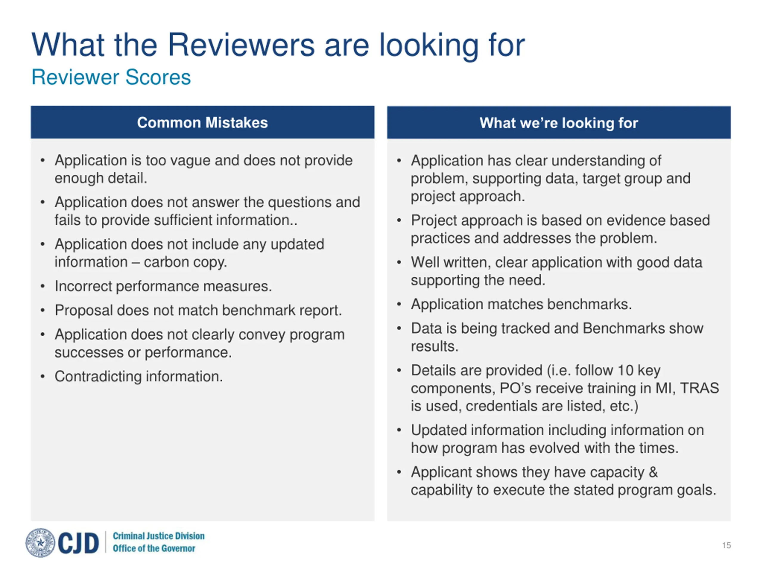 What the Reviewers are looking for Reviewer Scores Common Mistakes What we re looking for Application is too vague and does not provide enough detail. Application does not answer the questions and fails to provide sufficient information.. Application does not include any updated information carbon copy. Incorrect performance measures. Proposal does not match benchmark report. Application does not clearly convey program successes or performance. Contradicting information. Application has clear understanding of problem, supporting data, target group and project approach. Project approach is based on evidence based practices and addresses the problem. Well written, clear application with good data supporting the need. Application matches benchmarks. Data is being tracked and Benchmarks show results. Details are provided (i.e. follow 10 key components, PO s receive training in MI, TRAS is used, credentials are listed, etc.) Updated information including information on how program has evolved with the times. Applicant shows they have capacity & capability to execute the stated program goals. 15