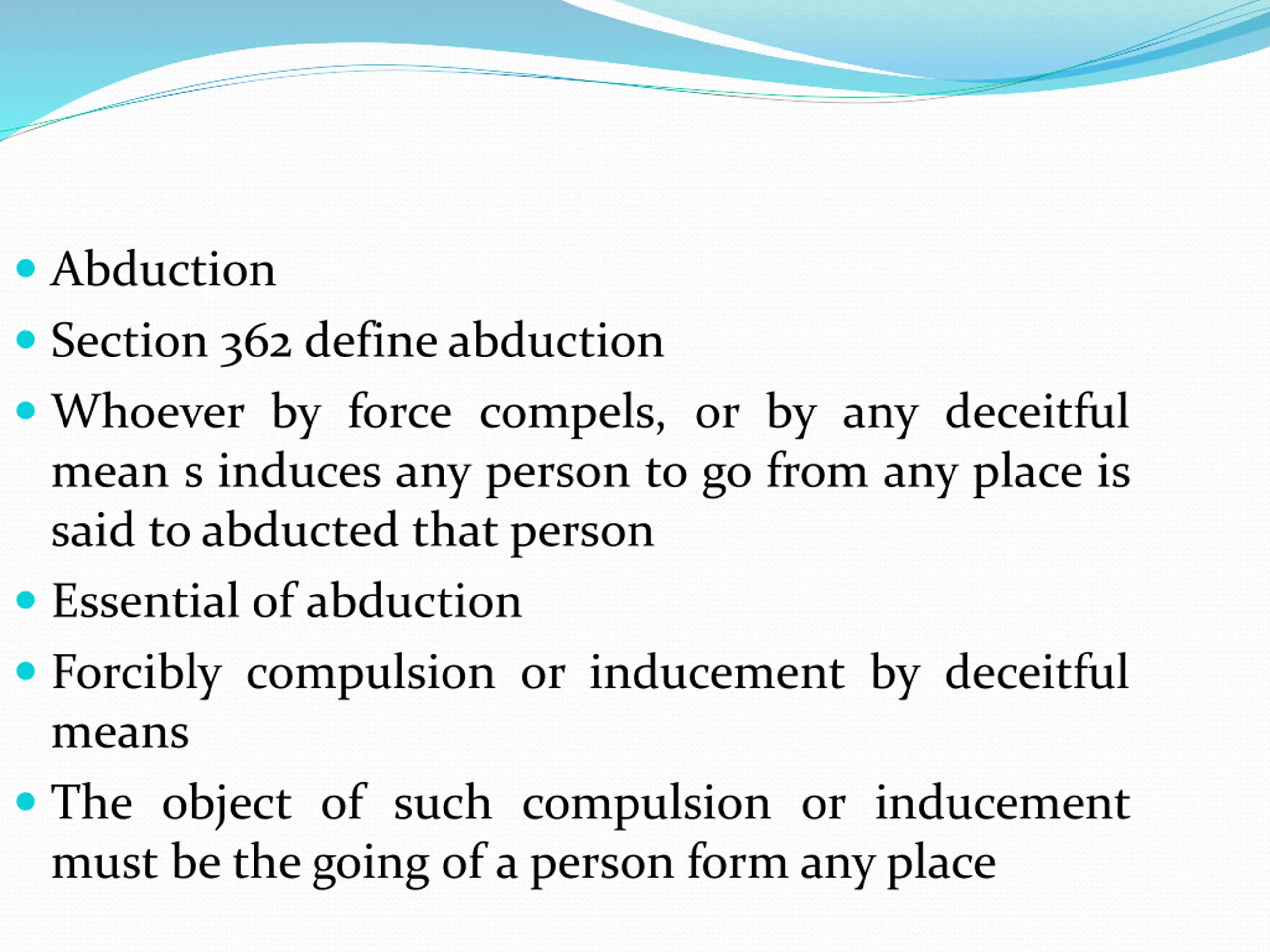 Abduction Section 362 defineabduction Whoever by force compels, or by any deceitful mean s induces any person to go from any place is said to abducted that person Essential of abduction Forcibly compulsion or inducement by deceitful means The object of such compulsion or inducement must be the going of a person form any place