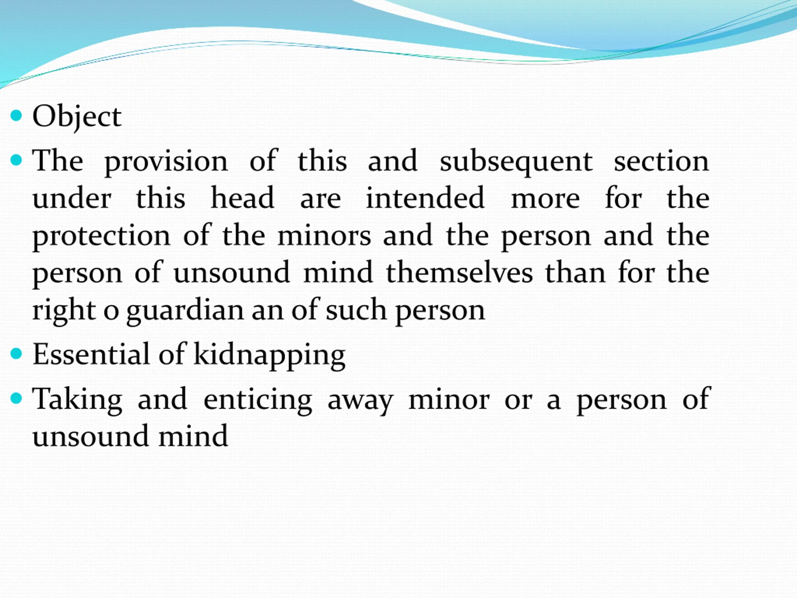 Object The provision of this and subsequent section under this head are intended more for the protection of the minors and the person and the person of unsound mind themselves than for the right o guardian an of such person Essential of kidnapping Taking and enticing away minor or a person of unsound mind
