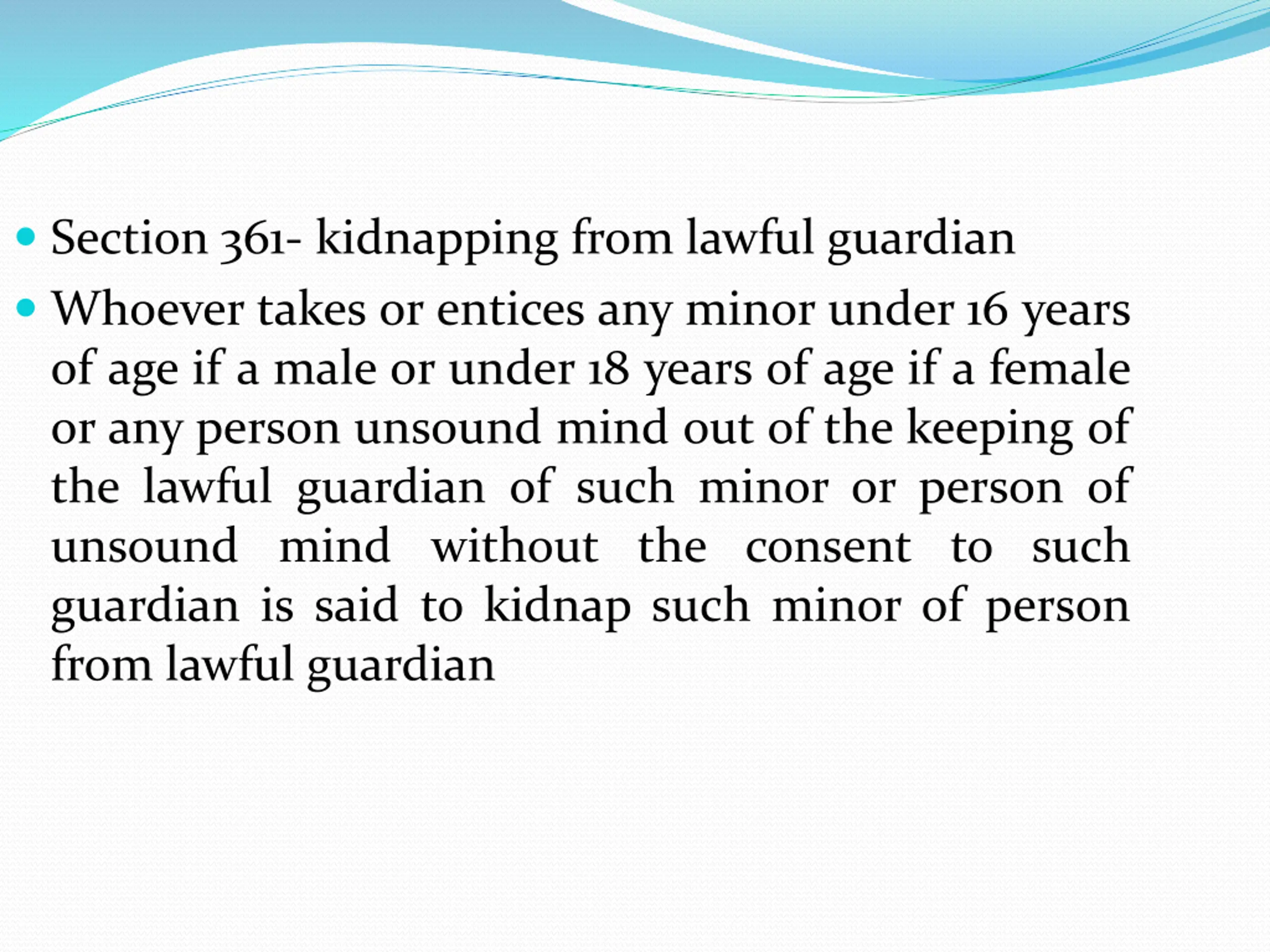 Section 361- kidnapping from lawful guardian Whoever takes or entices any minor under 16 years of age if a male or under 18 years of age if a female or any person unsound mind out of the keeping of the lawful guardian of such minor or person of unsound mind without the consent to such guardian is said to kidnap such minor of person from lawful guardian
