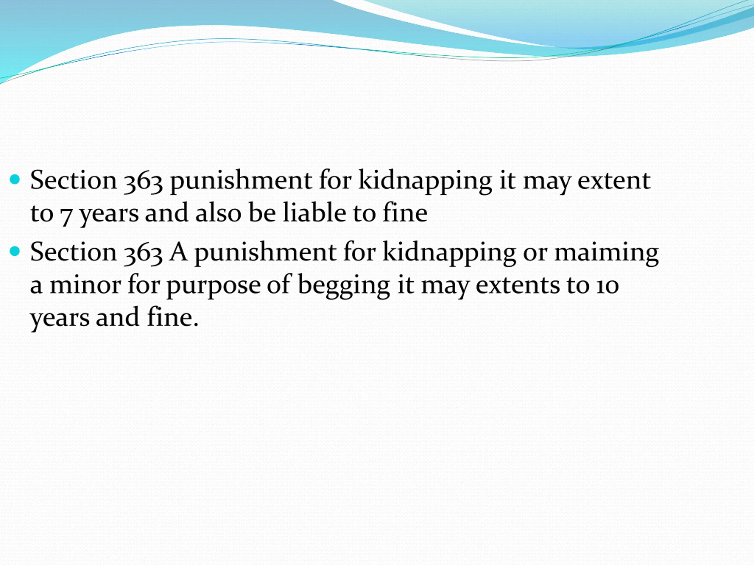 Section 363 punishment for kidnapping it may extent to 7 years and also be liable to fine Section 363 A punishment for kidnapping or maiming a minor for purpose of begging it may extents to 10 years and fine.