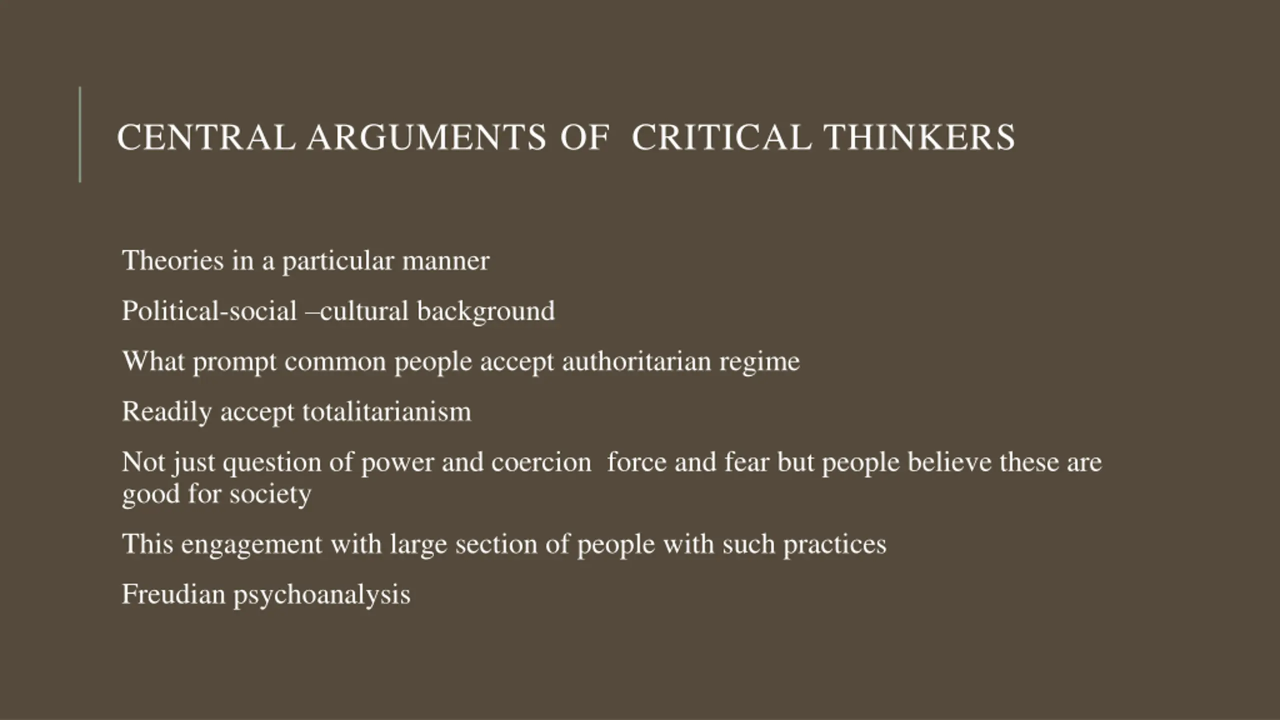 CENTRAL ARGUMENTS OF CRITICAL THINKERS Theories in a particular manner Political-social cultural background What prompt common people accept authoritarian regime Readily accept totalitarianism Not just question of power and coercion force and fear but people believe these are good for society This engagement with large section of people with such practices Freudian psychoanalysis