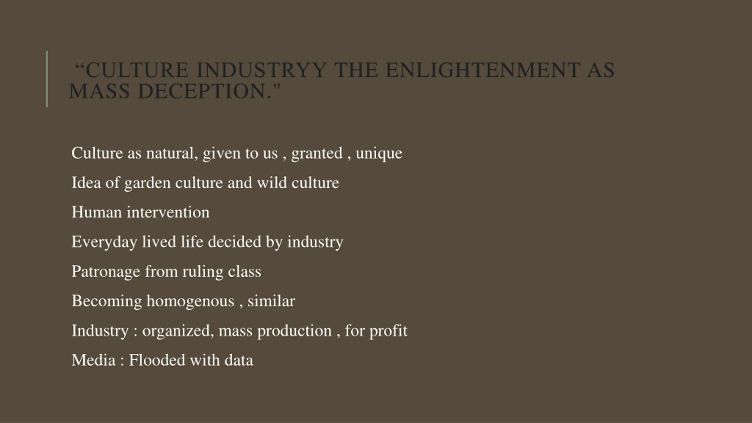 CULTURE INDUSTRYY THE ENLIGHTENMENT AS MASS DECEPTION." Culture as natural, given to us , granted , unique Idea of garden culture and wild culture Human intervention Everyday lived life decided by industry Patronage from ruling class Becoming homogenous , similar Industry : organized, mass production , for profit Media : Flooded with data