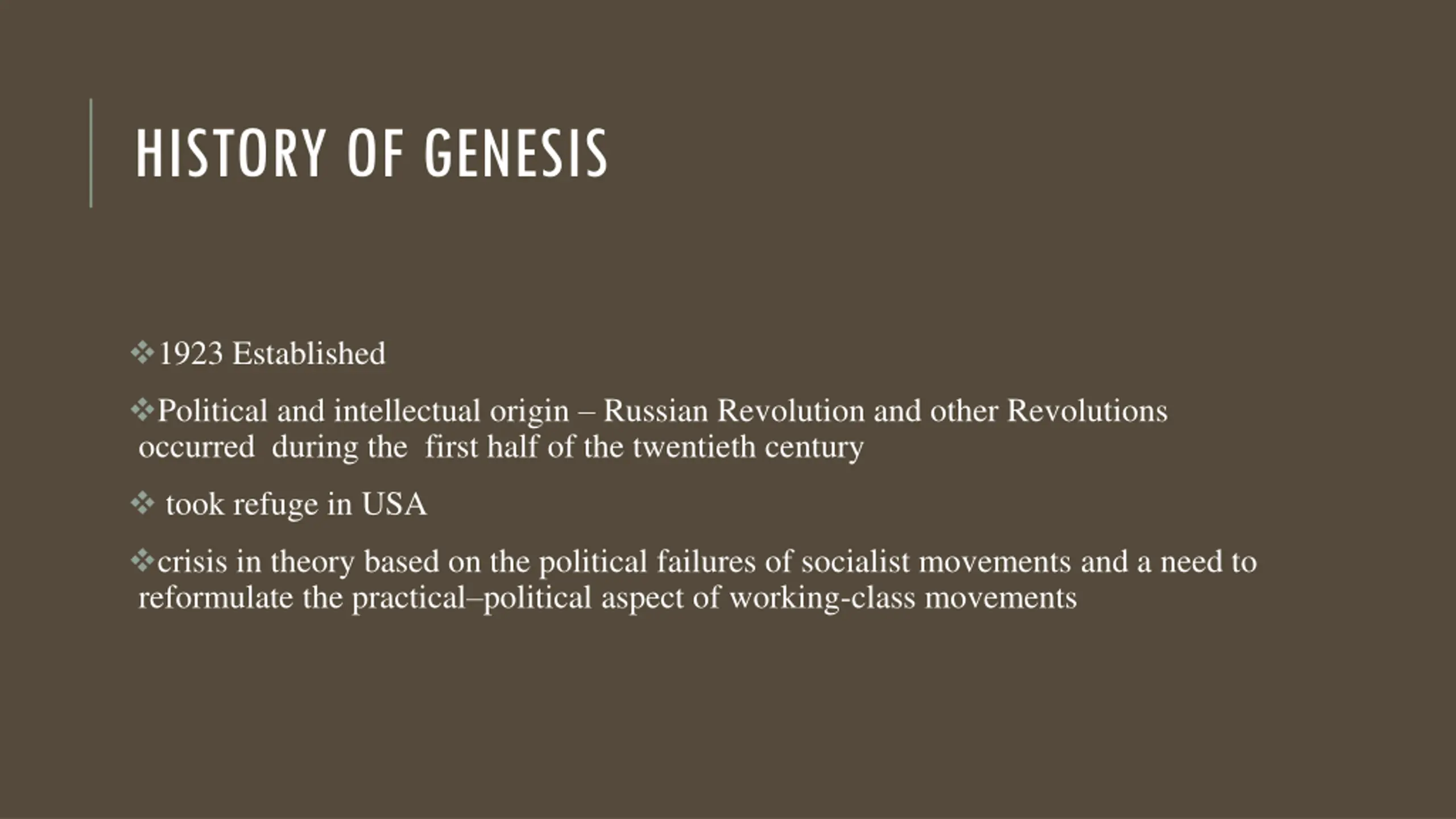 HISTORY OF GENESIS 1923 Established Political and intellectual origin Russian Revolution and other Revolutions occurred during the first half of the twentieth century took refuge in USA crisis in theory based on the political failures of socialist movements and a need to reformulate the practical political aspect of working-class movements