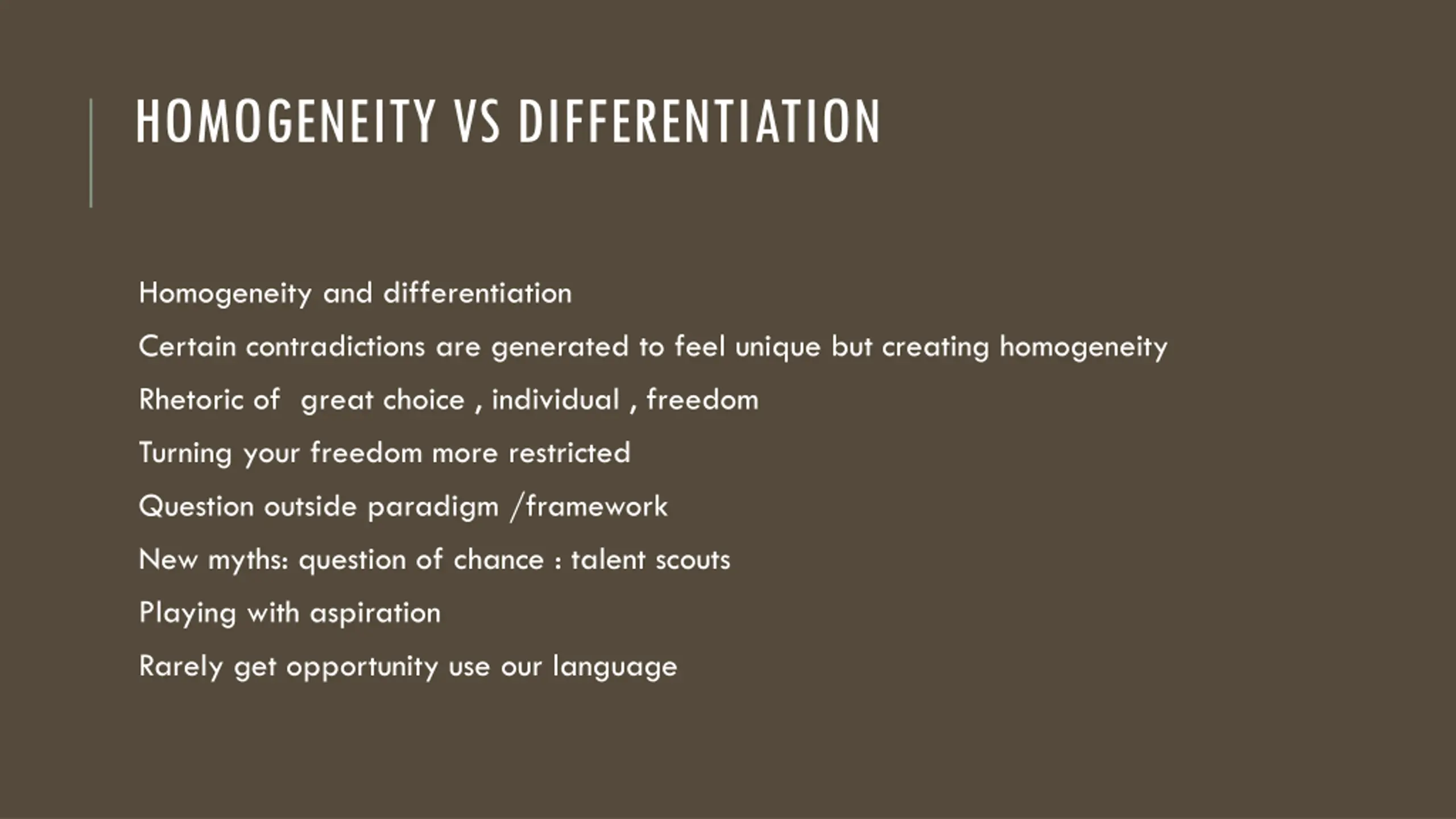 HOMOGENEITY VS DIFFERENTIATION Homogeneity and differentiation Certain contradictions are generated to feel unique but creating homogeneity Rhetoric of great choice , individual , freedom Turning your freedom more restricted Question outside paradigm /framework New myths: question of chance : talent scouts Playing with aspiration Rarely get opportunity use our language