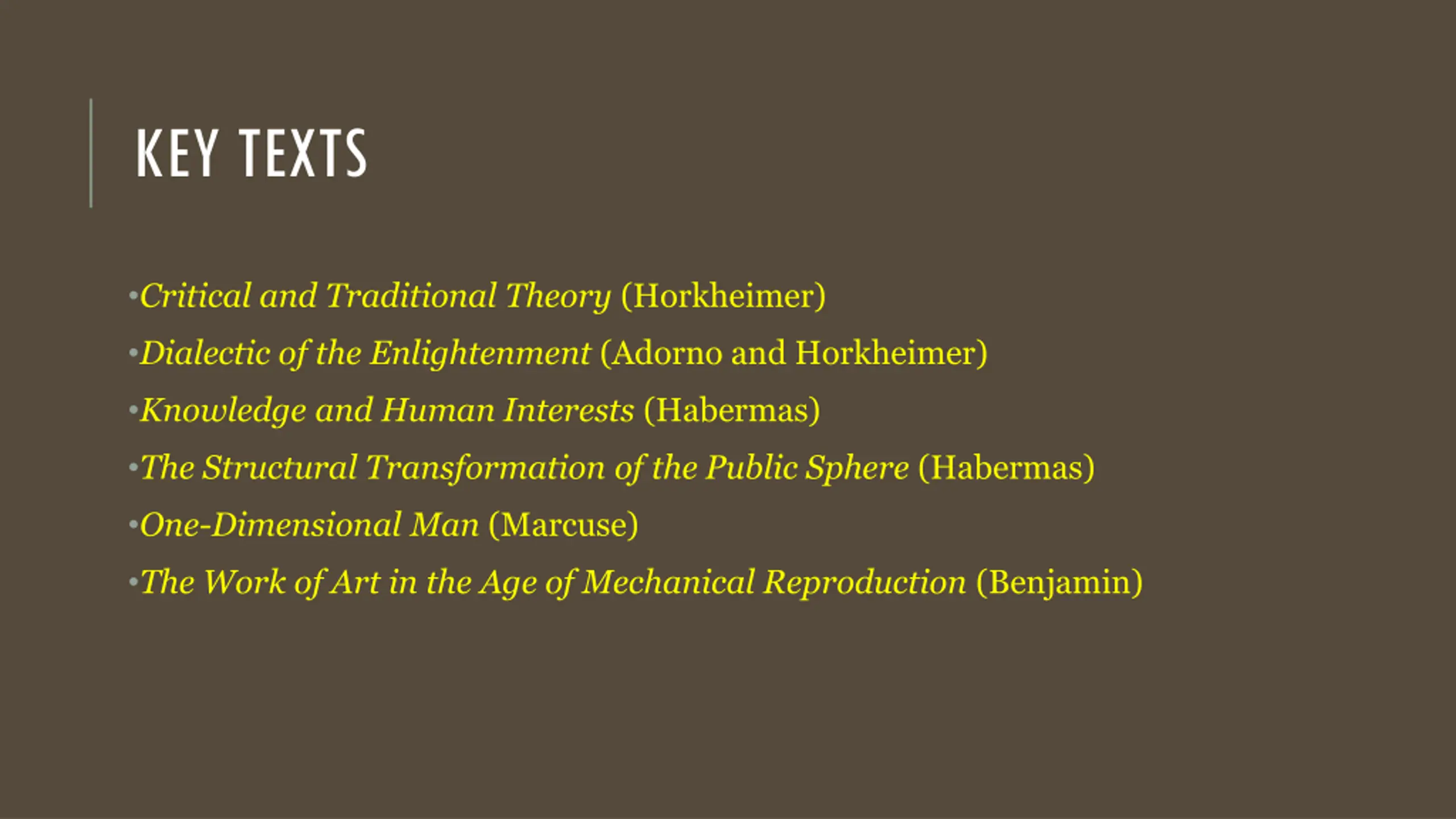 KEY TEXTS Critical and Traditional Theory (Horkheimer) Dialectic of the Enlightenment (Adorno and Horkheimer) Knowledge and Human Interests (Habermas) The Structural Transformation of the Public Sphere (Habermas) One-Dimensional Man (Marcuse) The Work of Art in the Age of Mechanical Reproduction (Benjamin)