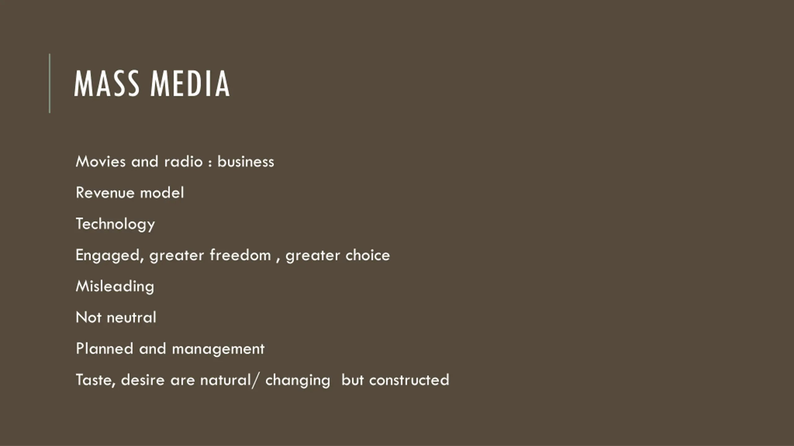 MASS MEDIA Movies and radio : business Revenue model Technology Engaged, greater freedom , greater choice Misleading Not neutral Planned and management Taste, desire are natural/ changing but constructed