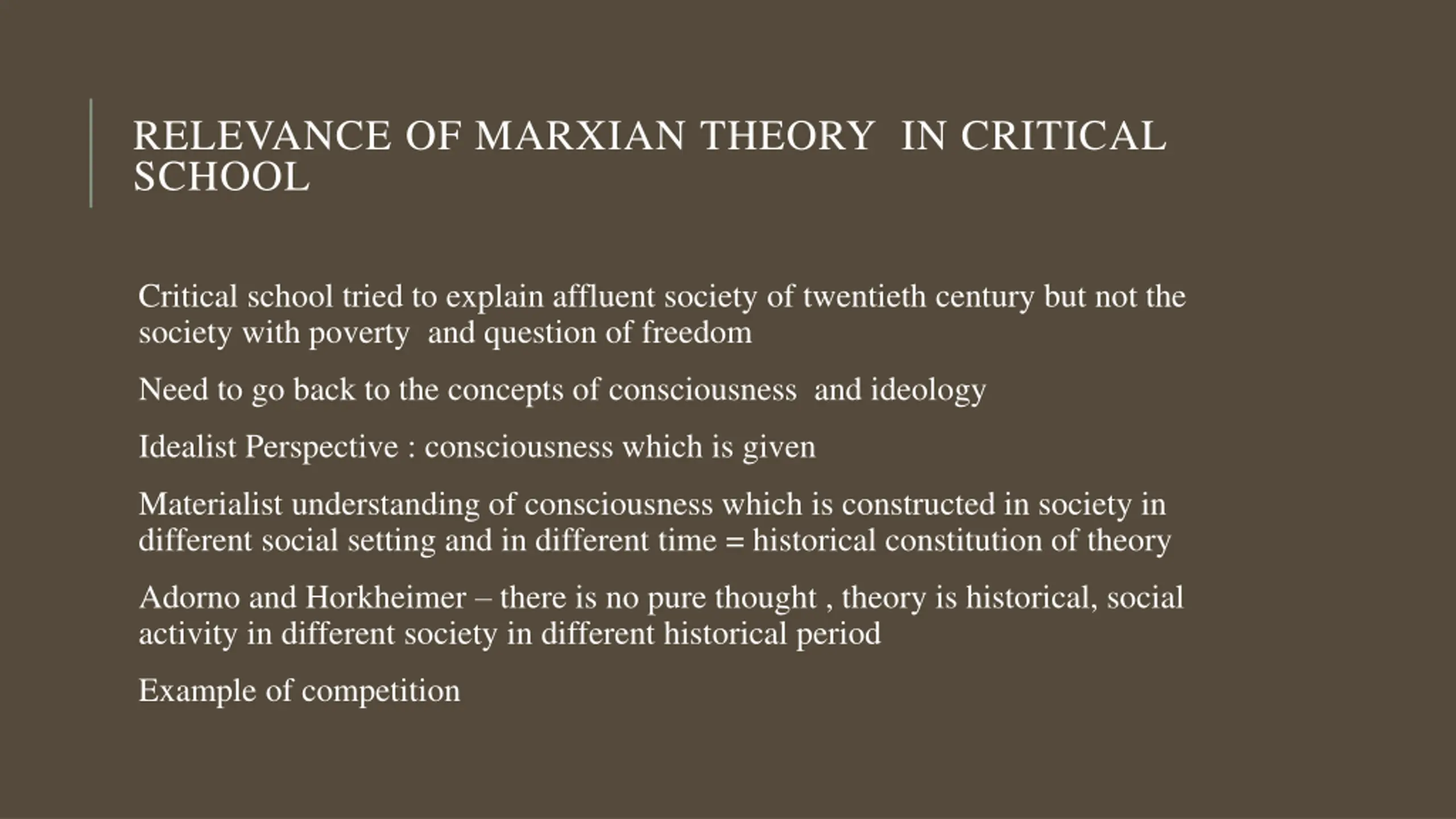RELEVANCE OF MARXIAN THEORY IN CRITICAL SCHOOL Critical school tried to explain affluent society of twentieth century but not the society with poverty and question of freedom Need to go back to the concepts of consciousness and ideology Idealist Perspective : consciousness which is given Materialist understanding of consciousness which is constructed in society in different social setting and in different time = historical constitution of theory Adorno and Horkheimer there is no pure thought , theory is historical, social activity in different society in different historical period Example of competition