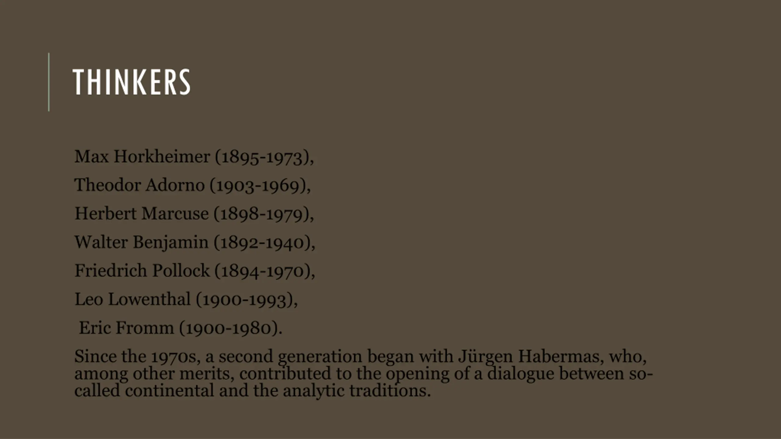 THINKERS Max Horkheimer (1895-1973), Theodor Adorno (1903-1969), Herbert Marcuse (1898-1979), Walter Benjamin (1892-1940), Friedrich Pollock (1894-1970), Leo Lowenthal (1900-1993), Eric Fromm (1900-1980). Since the 1970s, a second generation began with J rgen Habermas, who, among other merits, contributed to the opening of a dialogue between so- called continental and the analytic traditions.