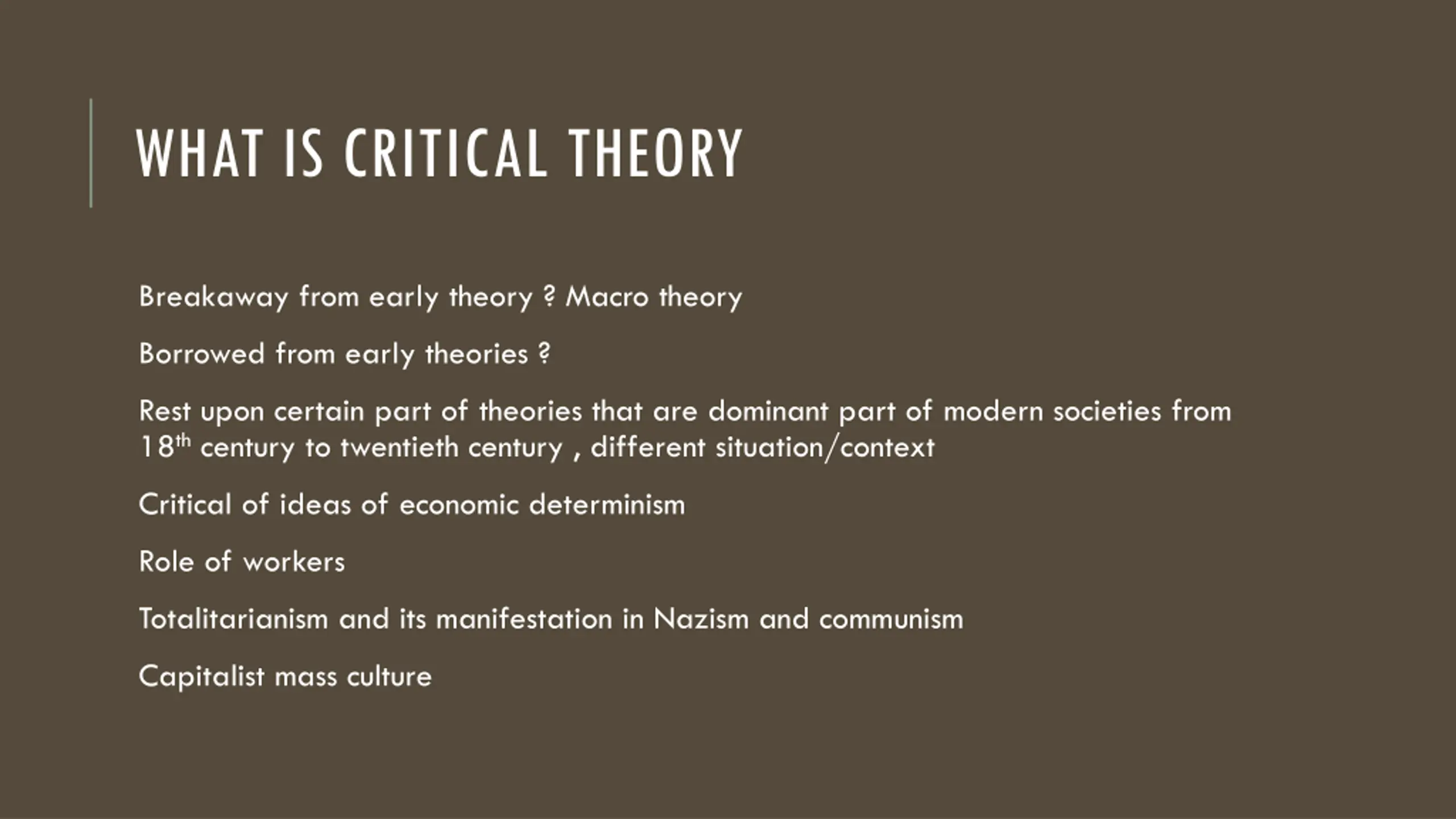 WHAT IS CRITICAL THEORY Breakaway from early theory ? Macro theory Borrowed from early theories ? Rest upon certain part of theories that are dominant part of modern societies from 18thcentury to twentieth century , different situation/context Critical of ideas of economic determinism Role of workers Totalitarianism and its manifestation in Nazism and communism Capitalist mass culture