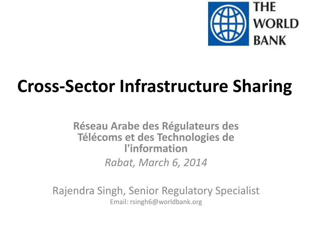 Cross-Sector Infrastructure Sharing R seau Arabe des R gulateurs des T l coms et des Technologies de l'information Rabat, March 6, 2014 Rajendra Singh, Senior Regulatory Specialist Email: rsingh6@worldbank.org