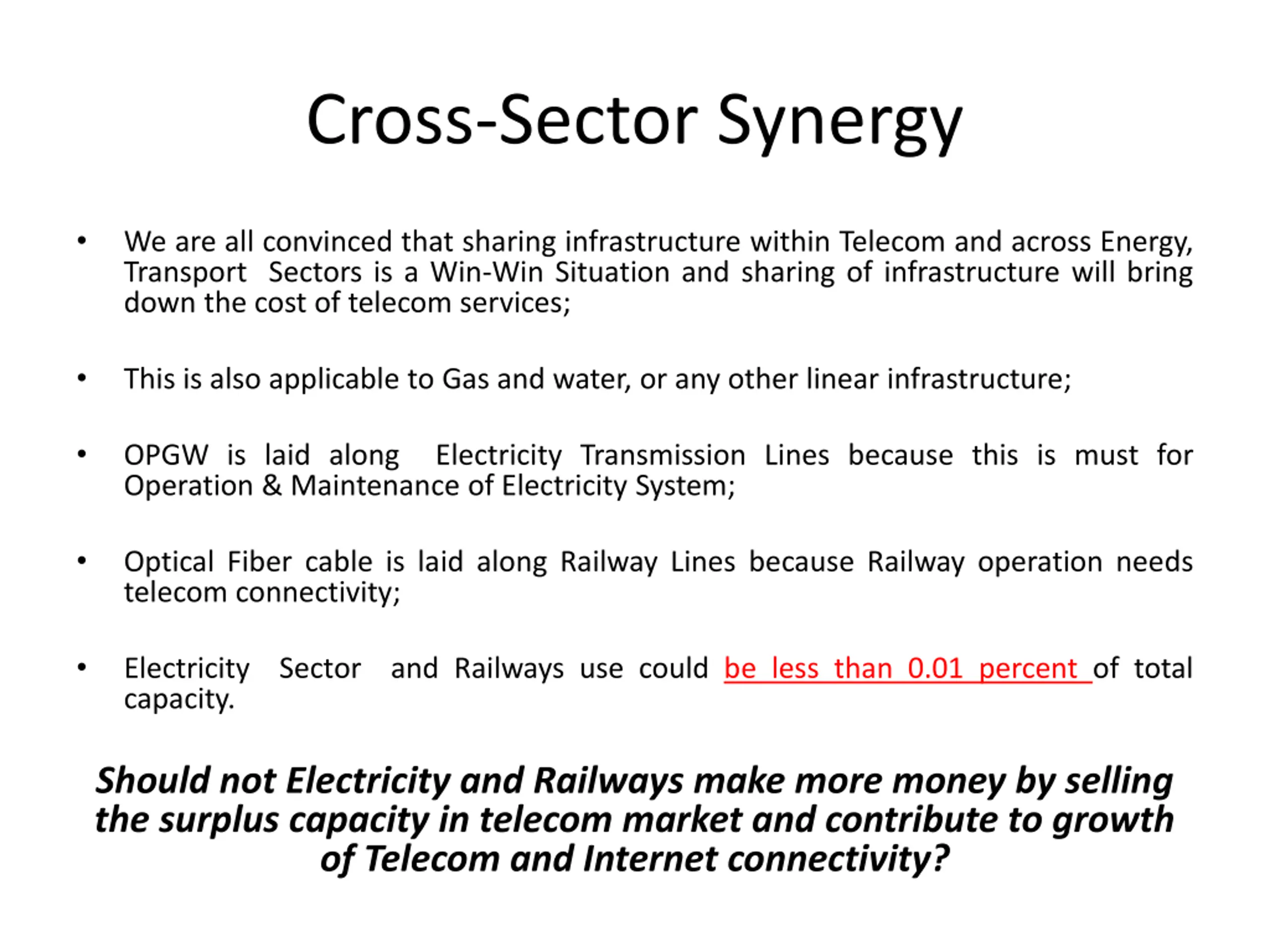 Cross-Sector Synergy We are all convinced that sharing infrastructure within Telecom and across Energy, Transport Sectors is a Win-Win Situation and sharing of infrastructure will bring down the cost of telecom services; This is also applicable to Gas and water, or any other linear infrastructure; OPGW is laid along Operation & Maintenance of Electricity System; Electricity Transmission Lines because this is must for Optical Fiber cable is laid along Railway Lines because Railway operation needs telecom connectivity; Electricity capacity. Sector and Railways use could be less than 0.01 percent of total Should not Electricity and Railways make more money by selling the surplus capacity in telecom market and contribute to growth of Telecom and Internet connectivity?
