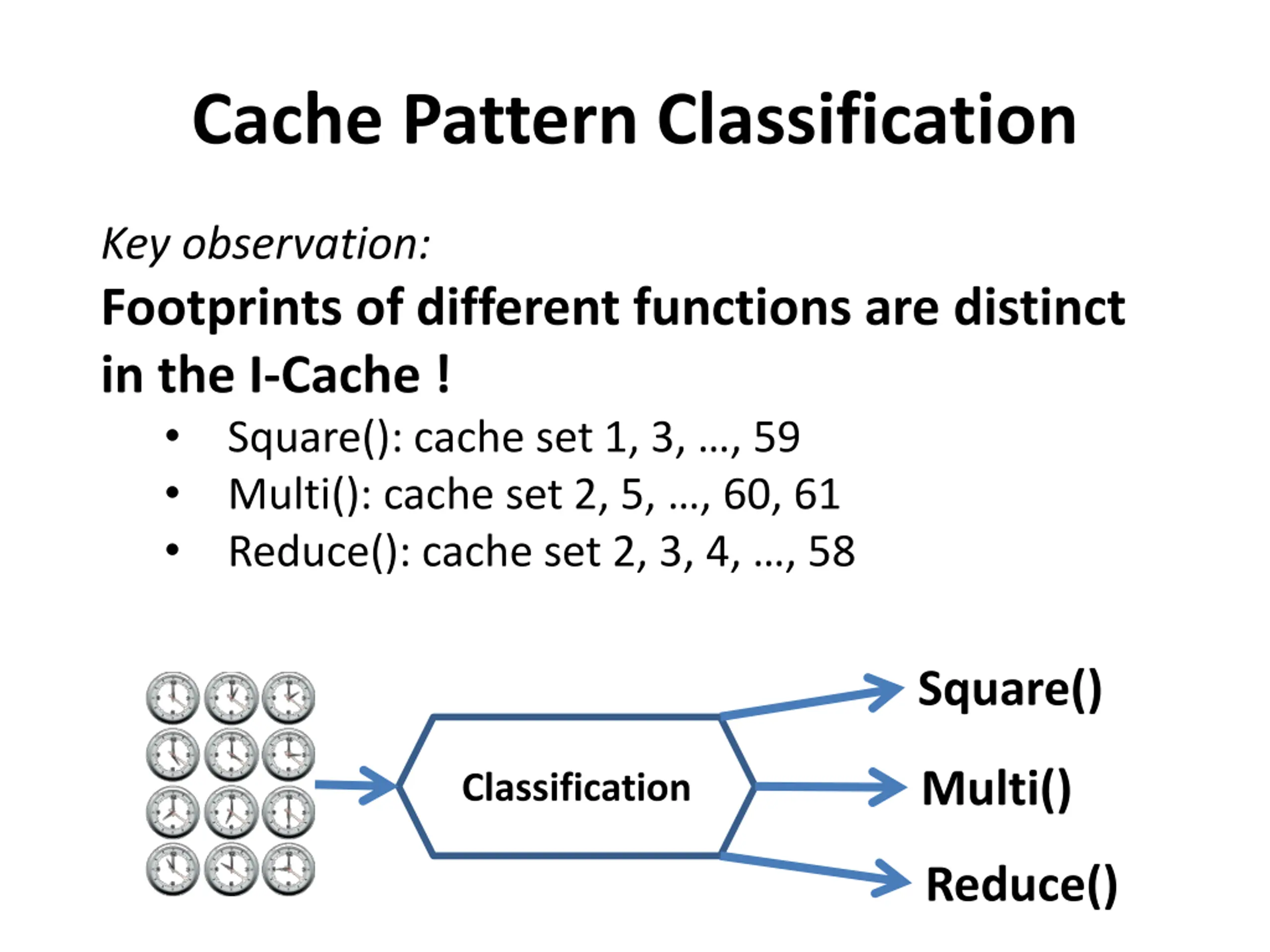 Cache Pattern Classification Key observation: Footprints of different functions are distinct in the I-Cache ! Square(): cache set 1, 3, , 59 Multi(): cache set 2, 5, , 60, 61 Reduce(): cache set 2, 3, 4, , 58 Square() Multi() Classification Reduce()