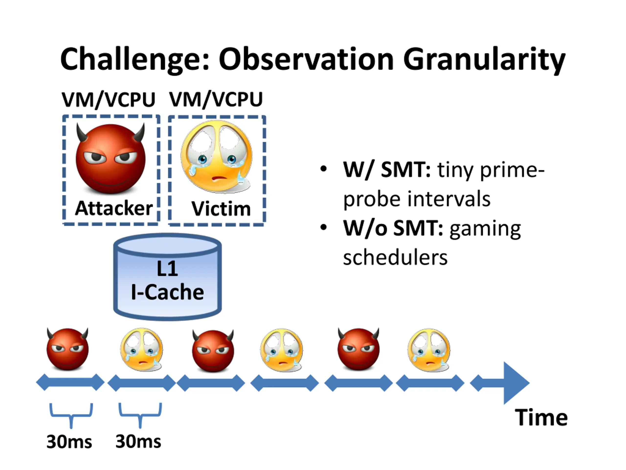 Challenge: Observation Granularity VM/VCPU VM/VCPU W/ SMT: tiny prime- probe intervals W/o SMT: gaming schedulers Attacker Victim L1 I-Cache Time 30ms 30ms