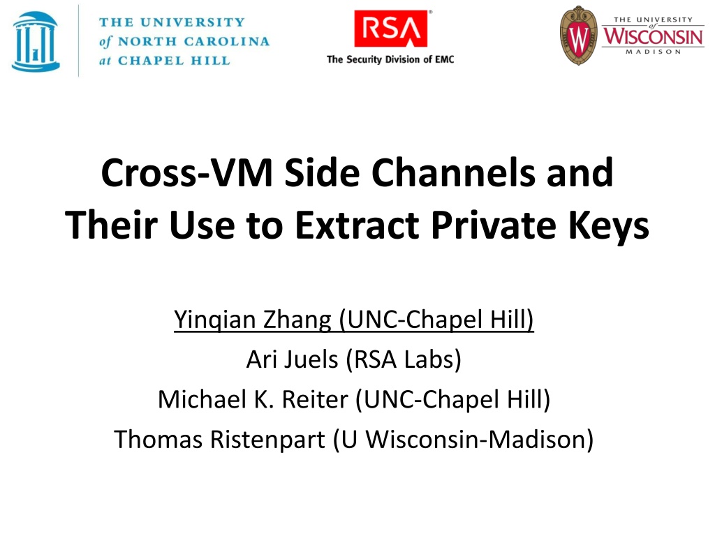 Cross-VM Side Channels and Their Use to Extract Private Keys Yinqian Zhang (UNC-Chapel Hill) Ari Juels (RSA Labs) Michael K. Reiter (UNC-Chapel Hill) Thomas Ristenpart (U Wisconsin-Madison)