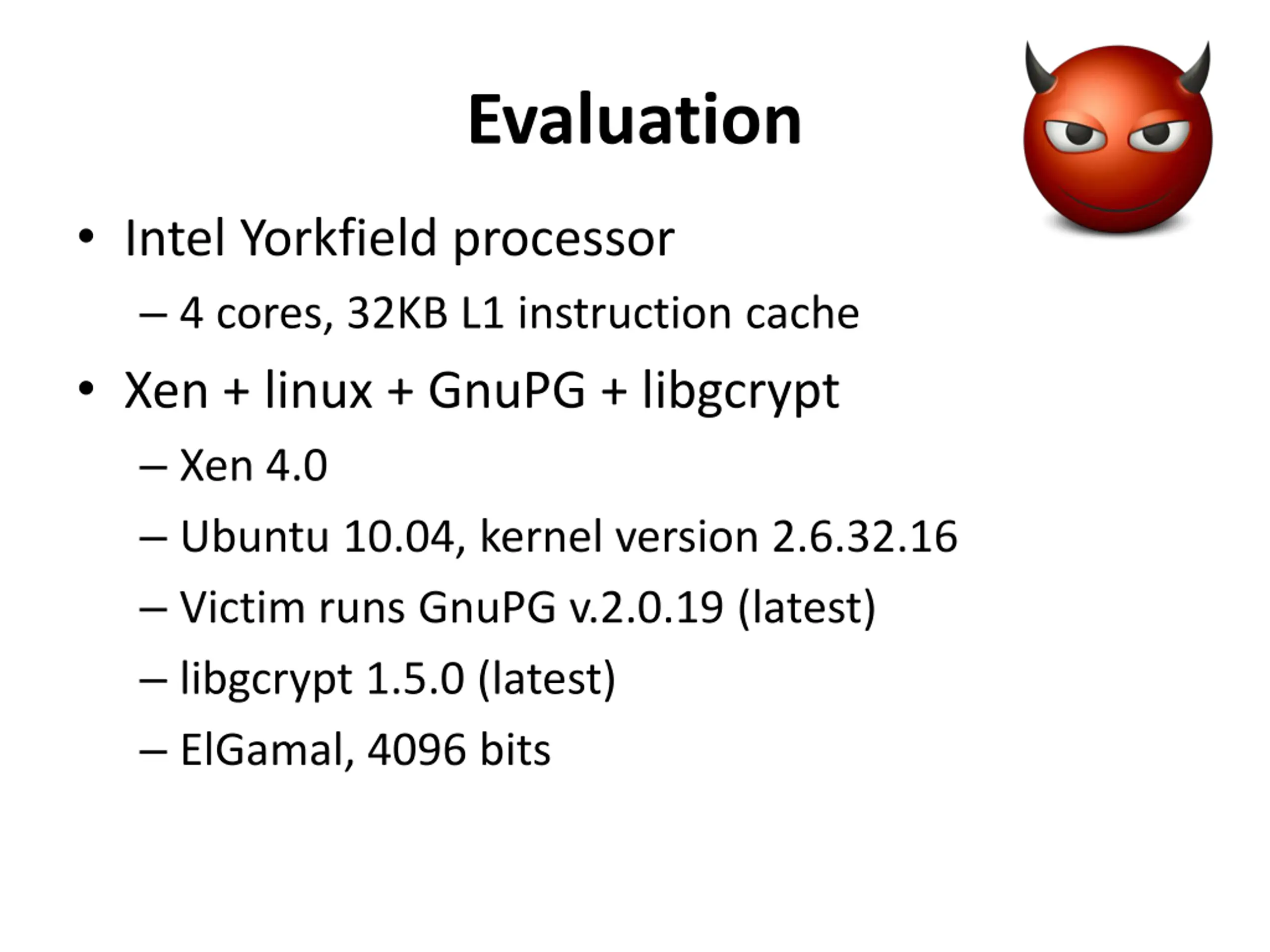 Evaluation Intel Yorkfield processor 4 cores, 32KB L1 instruction cache Xen + linux + GnuPG + libgcrypt Xen 4.0 Ubuntu 10.04, kernel version 2.6.32.16 Victim runs GnuPG v.2.0.19 (latest) libgcrypt 1.5.0 (latest) ElGamal, 4096 bits