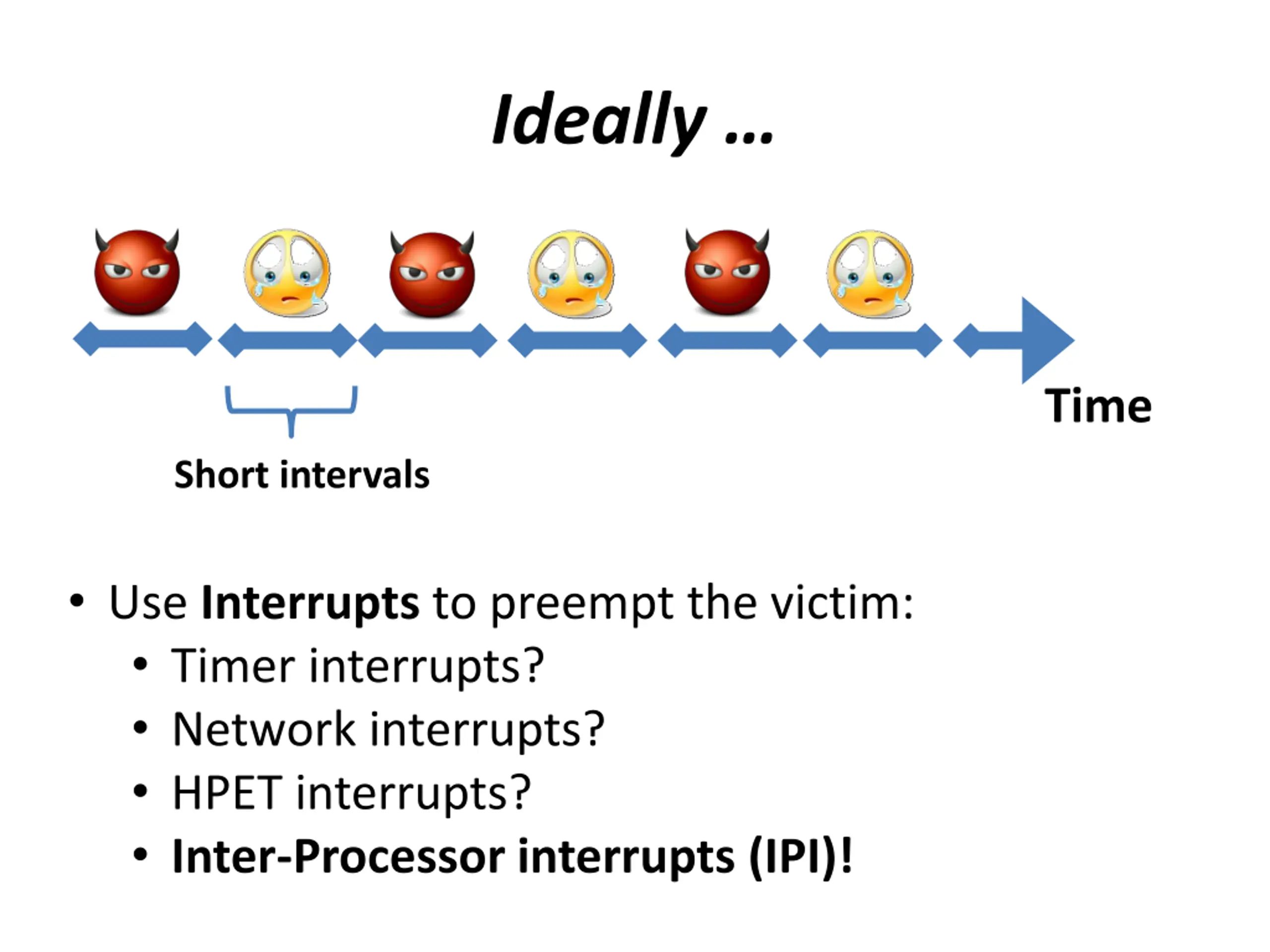Ideally Time Short intervals Use Interrupts to preempt the victim: Timer interrupts? Network interrupts? HPET interrupts? Inter-Processor interrupts (IPI)!