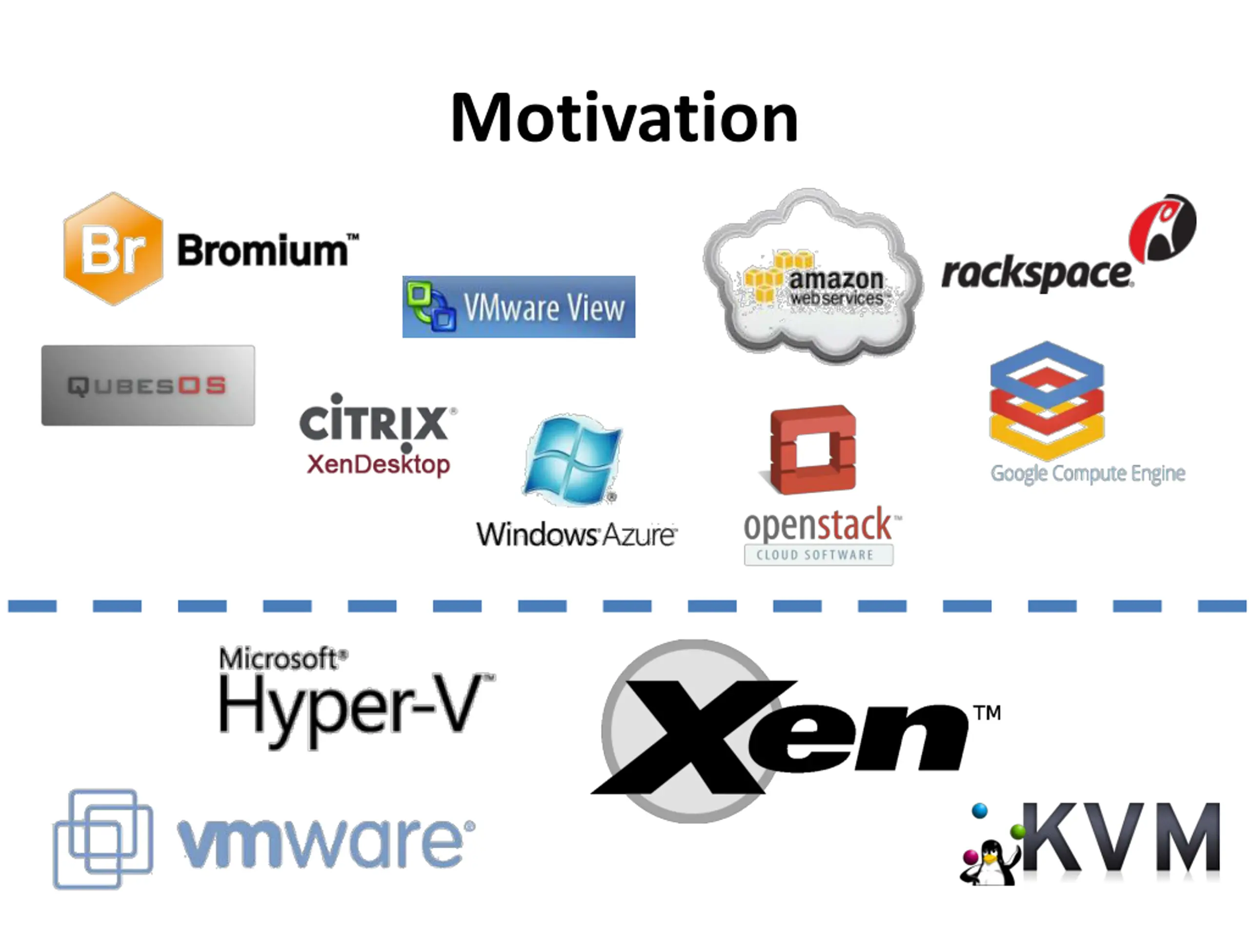 Security Isolation by Virtualization VM VM Crypto Keys Attacker Victim Virtualization Layer Computer Hardware
