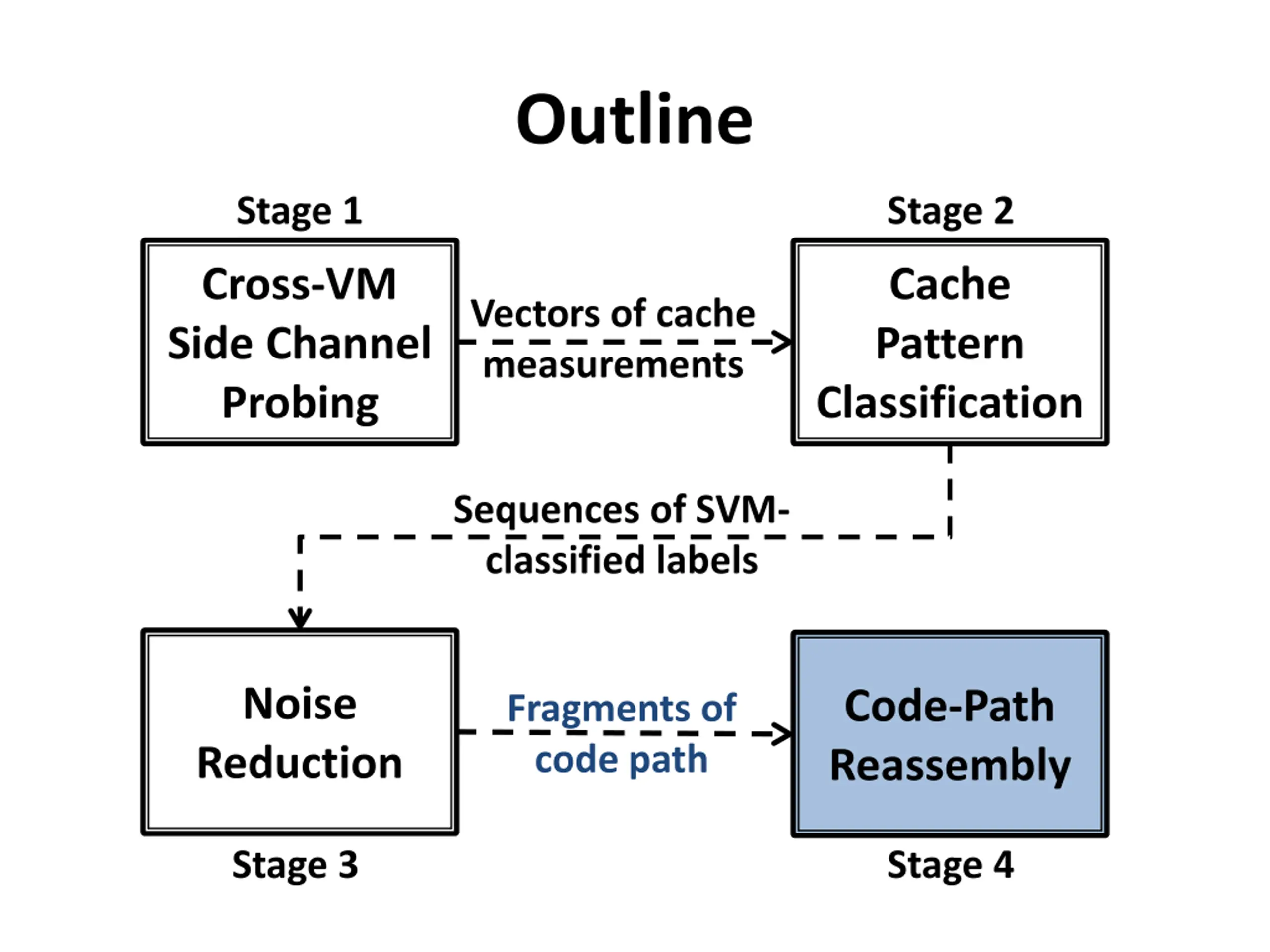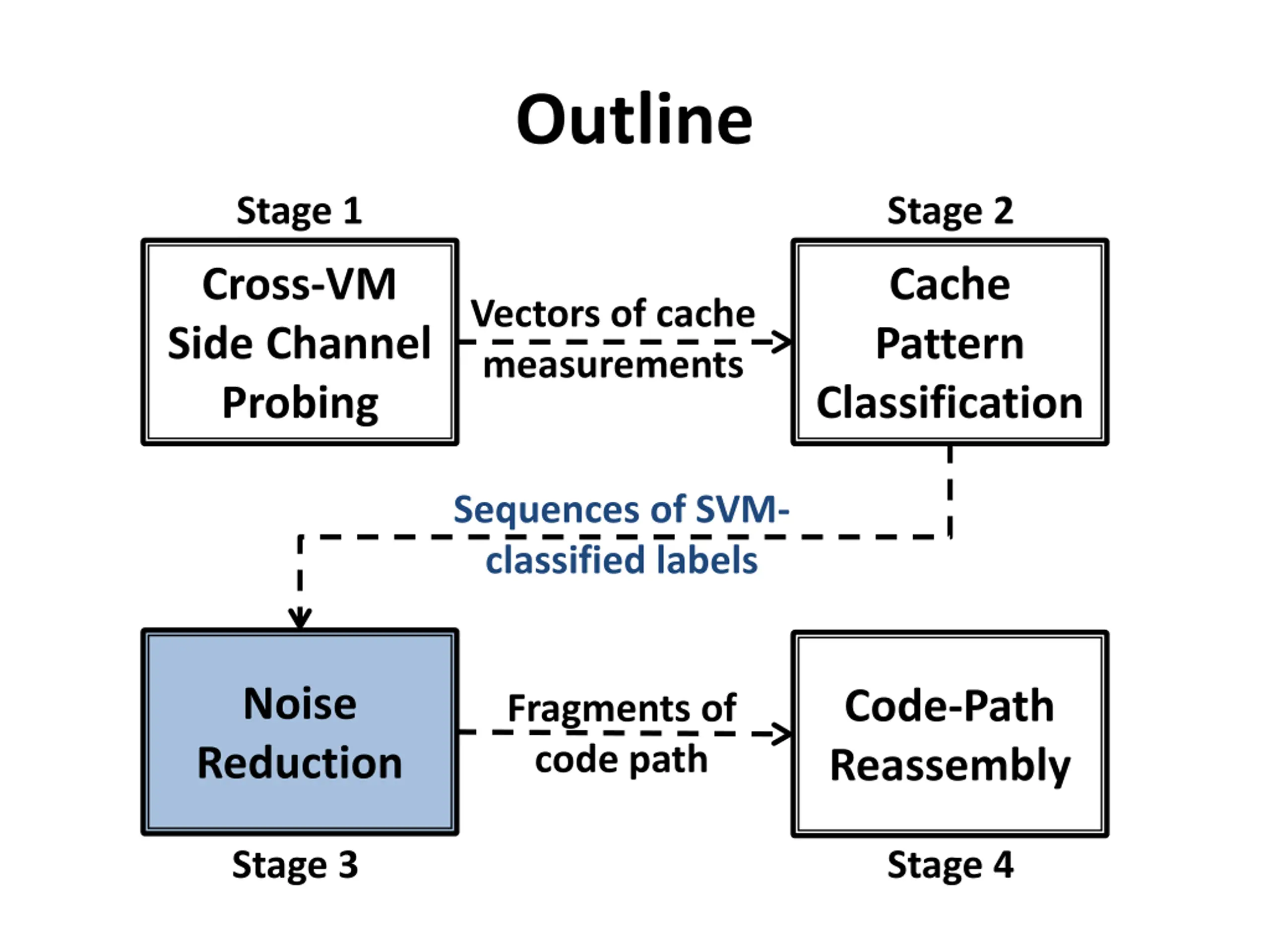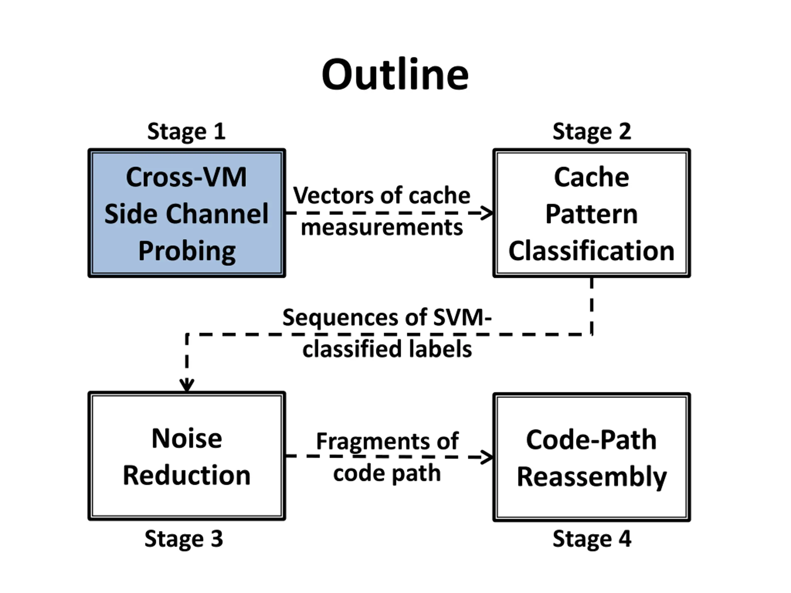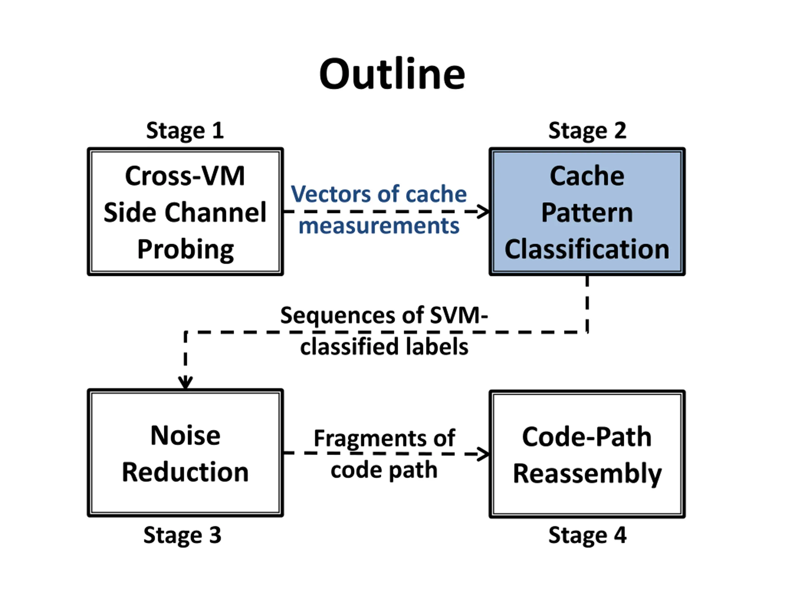 Outline Stage 1 Stage 2 Cross-VM Side Channel Probing Cache Pattern Classification Vectors of cache measurements Sequences of SVM- classified labels Noise Reduction Code-Path Reassembly Fragments of code path Stage 3 Stage 4