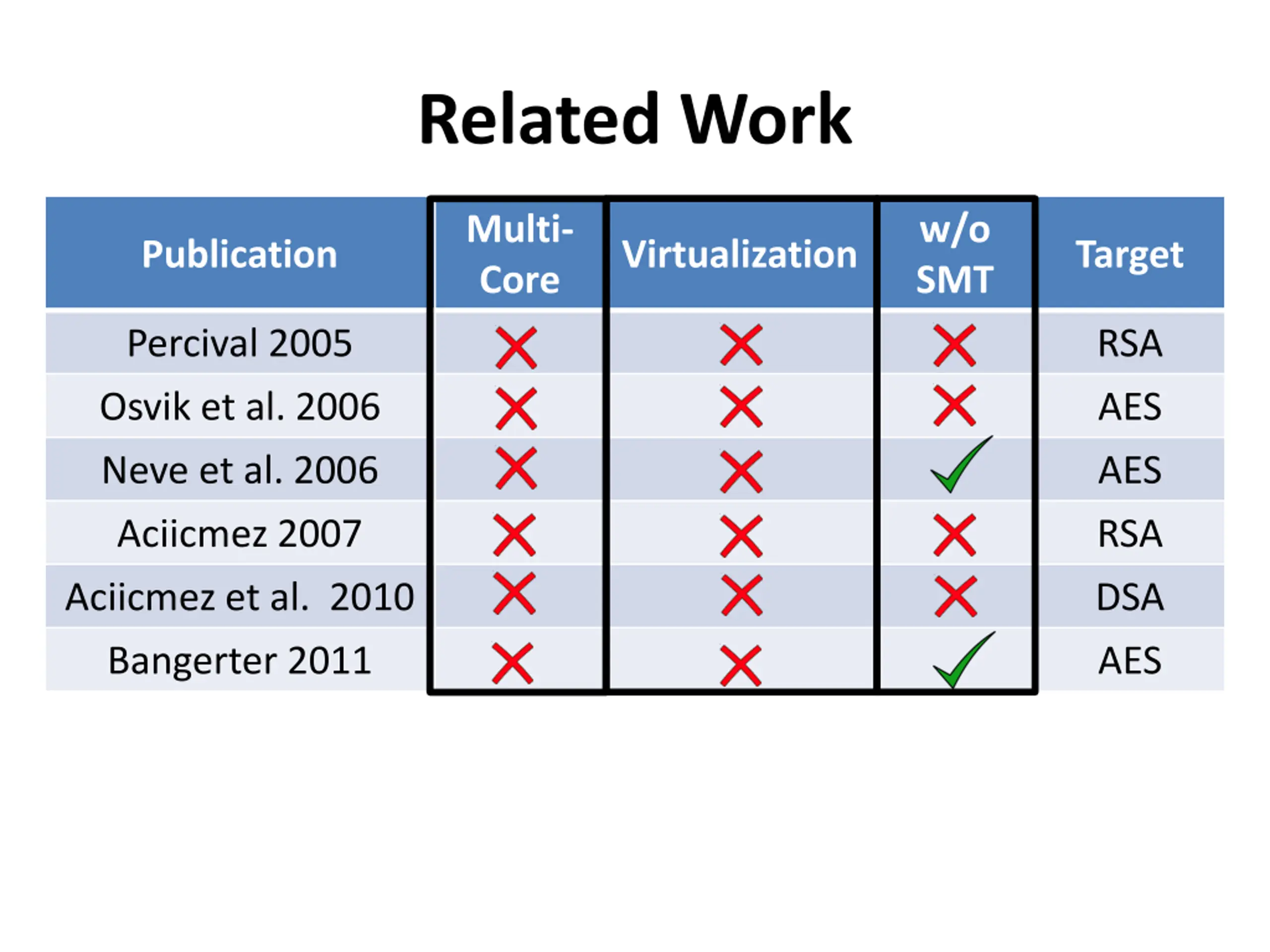 Related Work Multi- Core w/o SMT Publication Virtualization Target Percival 2005 RSA Osvik et al. 2006 Neve et al. 2006 AES AES Aciicmez 2007 RSA Aciicmez et al. 2010 DSA Bangerter 2011 AES
