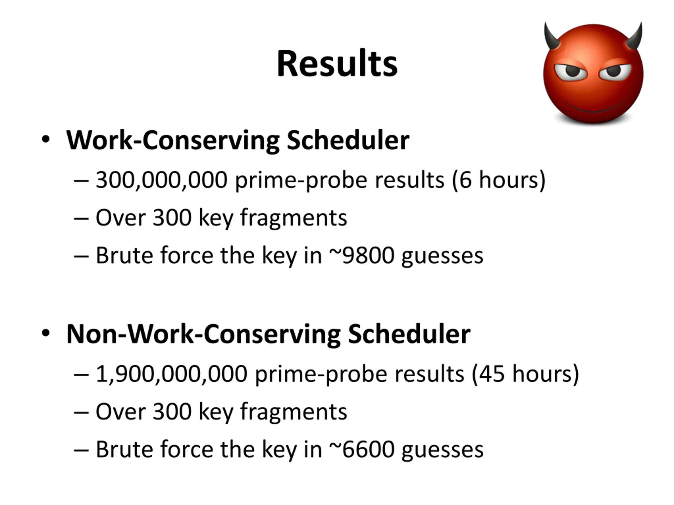 Results Work-Conserving Scheduler 300,000,000 prime-probe results (6 hours) Over 300 key fragments Brute force the key in ~9800 guesses Non-Work-Conserving Scheduler 1,900,000,000 prime-probe results (45 hours) Over 300 key fragments Brute force the key in ~6600 guesses