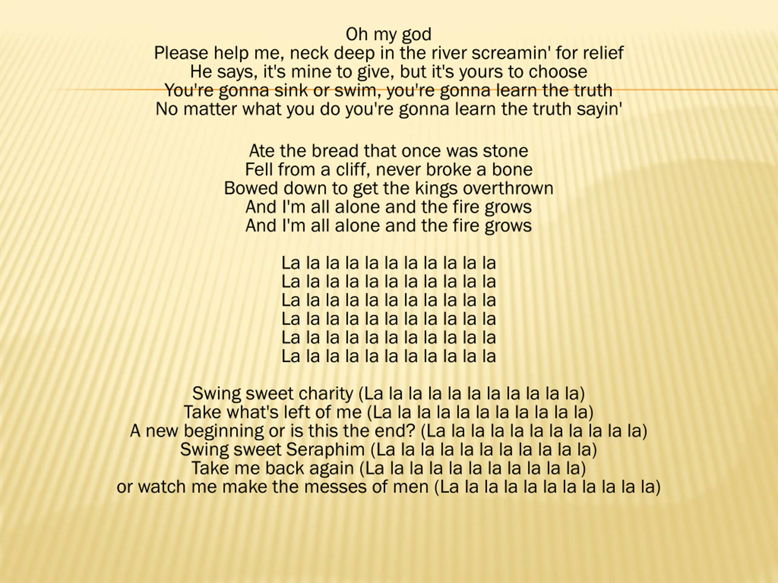 Oh my god Please help me, neck deep in the river screamin' for relief He says, it's mine to give, but it's yours to choose You're gonna sink or swim, you're gonna learn the truth No matter what you do you're gonna learn the truth sayin' Ate the bread that once was stone Fell from a cliff, never broke a bone Bowed down to get the kings overthrown And I'm all alone and the fire grows And I'm all alone and the fire grows La la la la la la la la la la la La la la la la la la la la la la La la la la la la la la la la la La la la la la la la la la la la La la la la la la la la la la la La la la la la la la la la la la Swing sweet charity (La la la la la la la la la la la) Take what's left of me (La la la la la la la la la la la) A new beginning or is this the end? (La la la la la la la la la la la) Swing sweet Seraphim (La la la la la la la la la la la) Take me back again (La la la la la la la la la la la) or watch me make the messes of men (La la la la la la la la la la la)