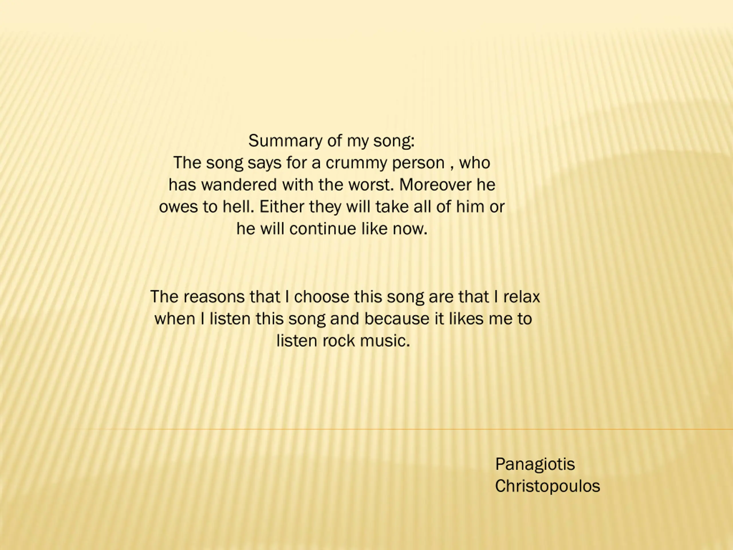 Summary of my song: The song says for a crummy person , who has wandered with the worst. Moreover he owes to hell. Either they will take all of him or he will continue like now. The reasons that I choose this song are that I relax when I listen this song and because it likes me to listen rock music. Panagiotis Christopoulos