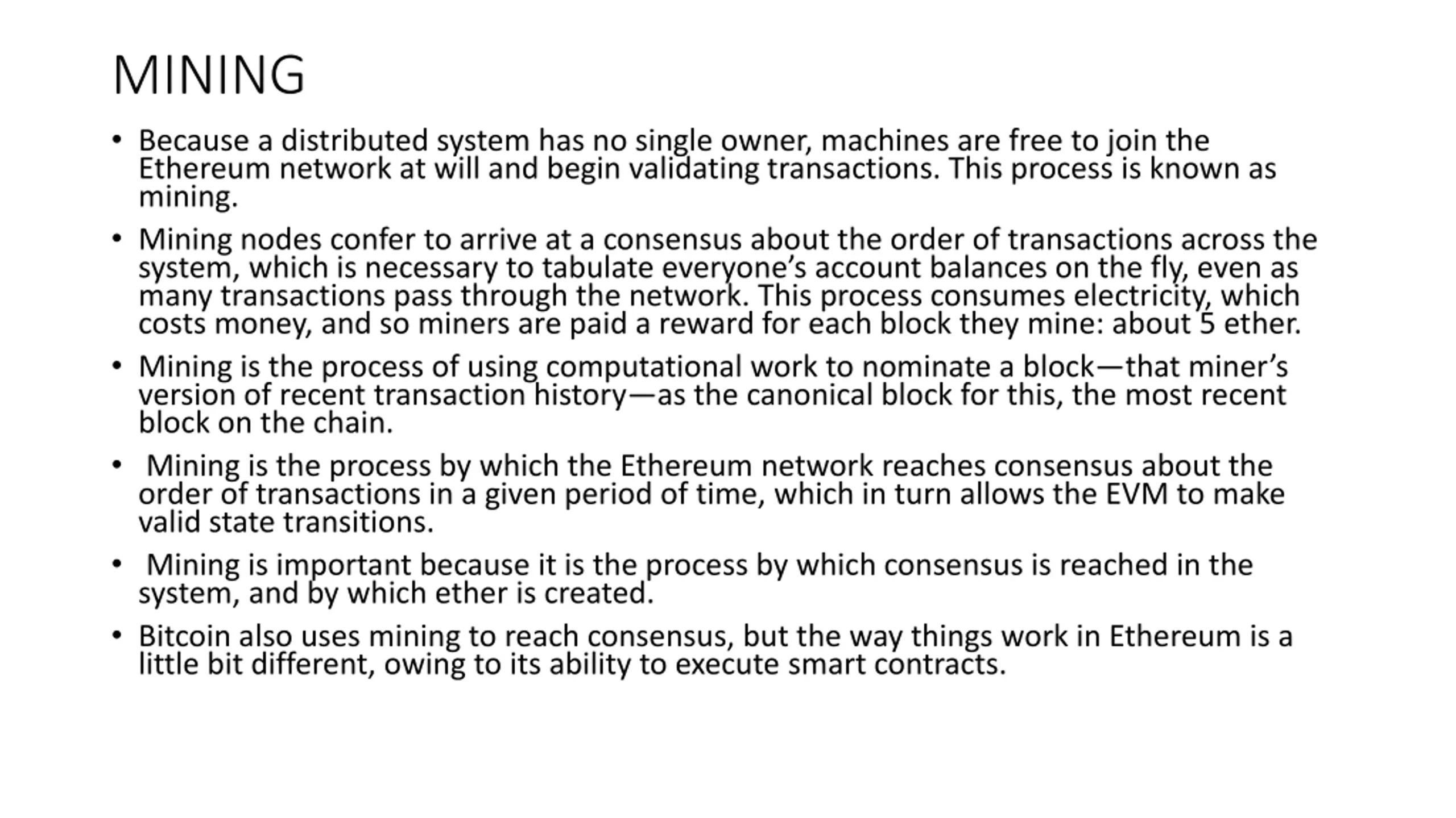 MINING Because a distributed system has no single owner, machines are free to join the Ethereum network at will and begin validating transactions. This process is known as mining. Mining nodes confer to arrive at a consensus about the order of transactions across the system, which is necessary to tabulate everyone s account balances on the fly, even as many transactions pass through the network. This process consumes electricity, which costs money, and so miners are paid a reward for each block they mine: about 5 ether. Mining is the process of using computational work to nominate a block that miner s version of recent transaction history as the canonical block for this, the most recent block on the chain. Mining is the process by which the Ethereum network reaches consensus about the order of transactions in a given period of time, which in turn allows the EVM to make valid state transitions. Mining is important because it is the process by which consensus is reached in the system, and by which ether is created. Bitcoin also uses mining to reach consensus, but the way things work in Ethereum is a little bit different, owing to its ability to execute smart contracts.