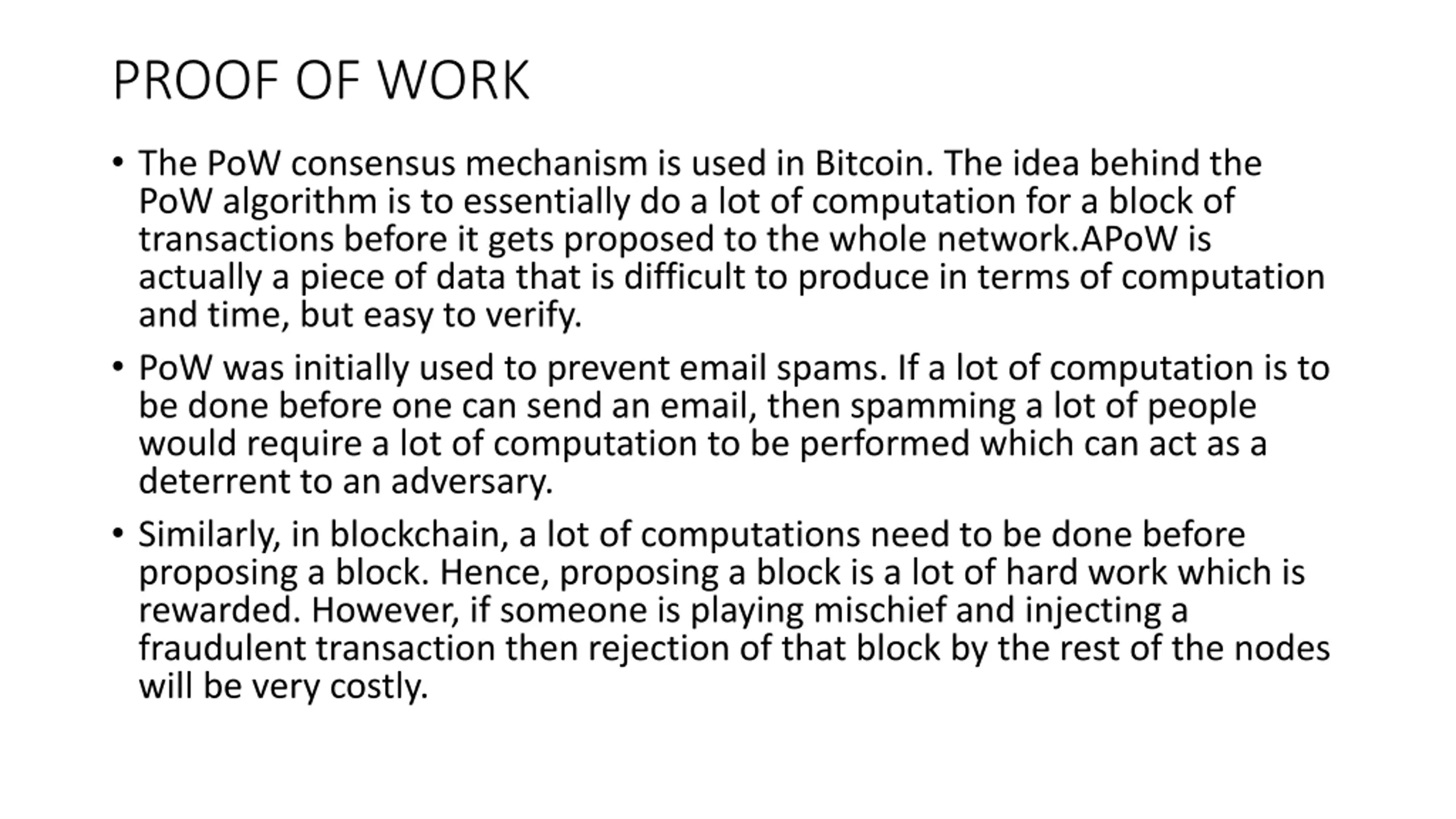 PROOF OF WORK The PoW consensus mechanism is used in Bitcoin. The idea behind the PoW algorithm is to essentially do a lot of computation for a block of transactions before it gets proposed to the whole network.APoW is actually a piece of data that is difficult to produce in terms of computation and time, but easy to verify. PoW was initially used to prevent email spams. If a lot of computation is to be done before one can send an email, then spamming a lot of people would require a lot of computation to be performed which can act as a deterrent to an adversary. Similarly, in blockchain, a lot of computations need to be done before proposing a block. Hence, proposing a block is a lot of hard work which is rewarded. However, if someone is playing mischief and injecting a fraudulent transaction then rejection of that block by the rest of the nodes will be very costly.